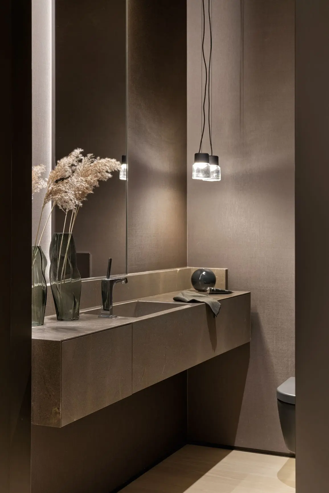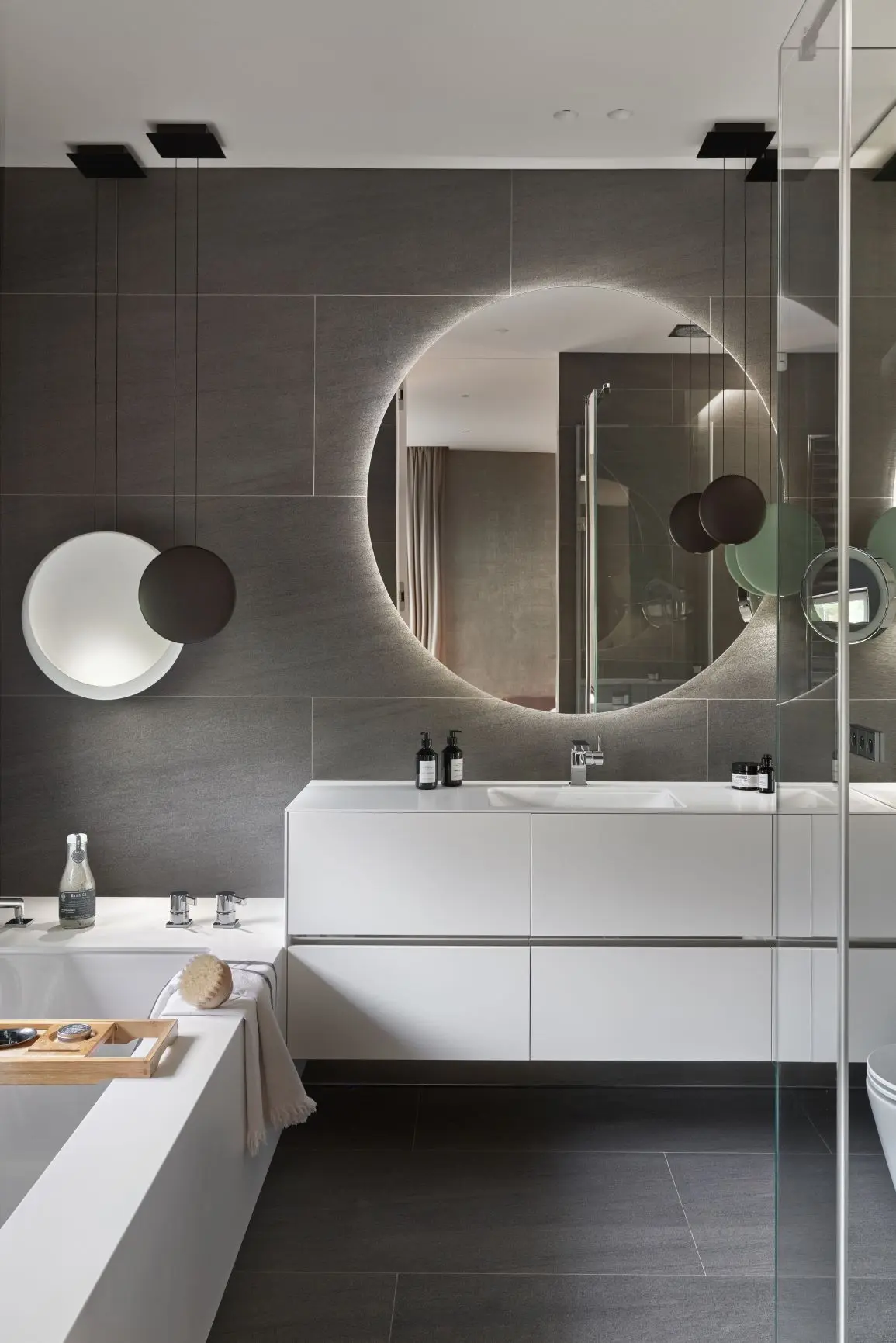 Master bedroom, sypialnia gospodarzy to wnętrze mieniące się wszystkimi odcieniami szarości, otulone naturalnymi tkaninami i fakturami. Ścianę u tapicerowanego wezgłowia łózka zdobi tapeta włoskiej marki Wall & Deco. Z sypialni wchodzimy do także utrzymanej w szarej tonacji łazienki. Wzrok przyciąga perłowa mozaika marki Mutina. Ciekawy efekt daje motyw koła, który dominuje we wnętrzu. Kształt lustra powtarzają oprawy lamp Cosmos firmy Vibia.