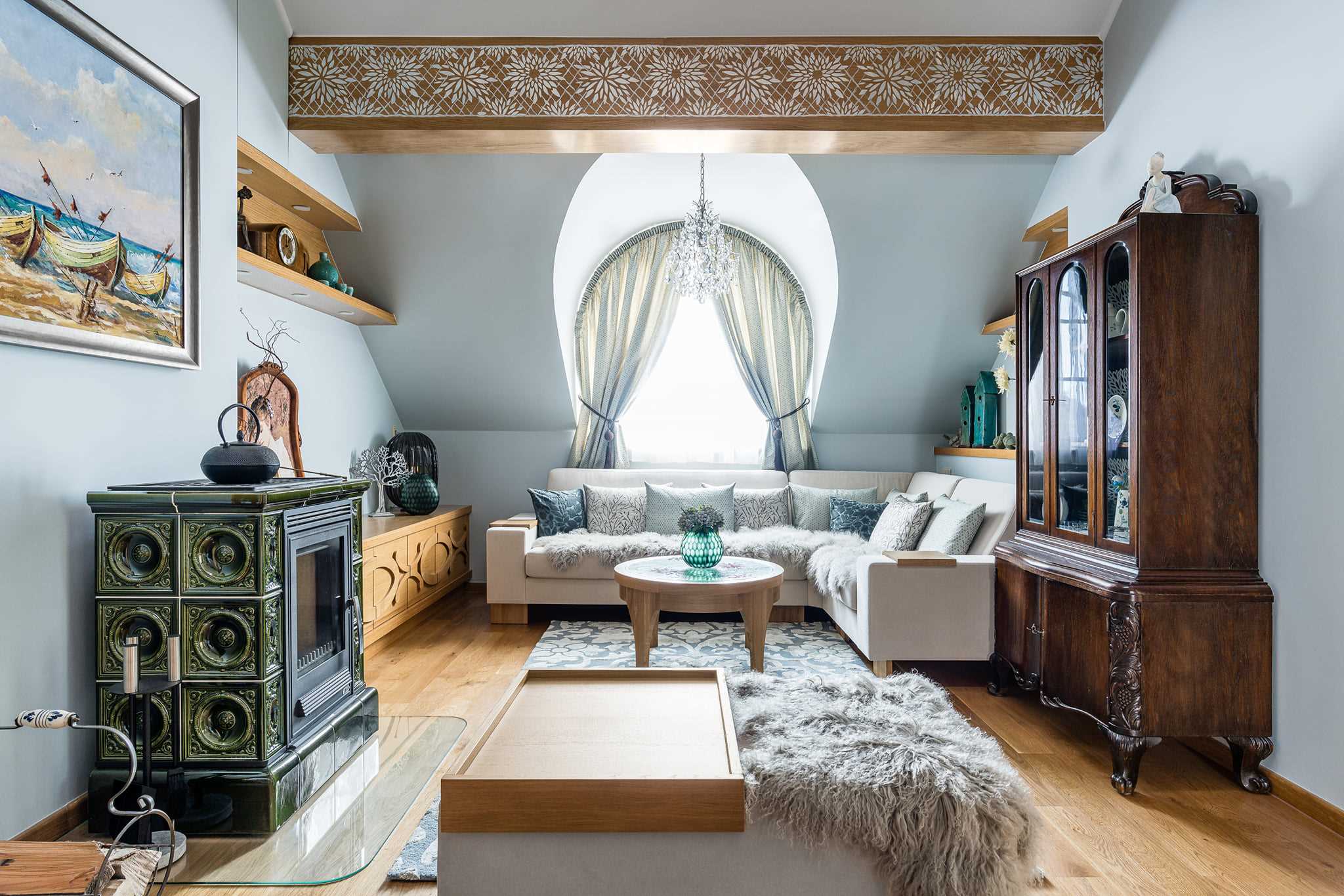 Zrealizowany projekt jest w stylu eklektycznym, którego głównym motywem jest ogromna miłość Inwestorki do wszelkich odcieni niebieskiego, błękitu. W końcu lokalizacja w paśmie nadmorskim zobowiązuje. Dwupoziomowy apartament na poddaszu jest częścią willi we Władysławowie.
