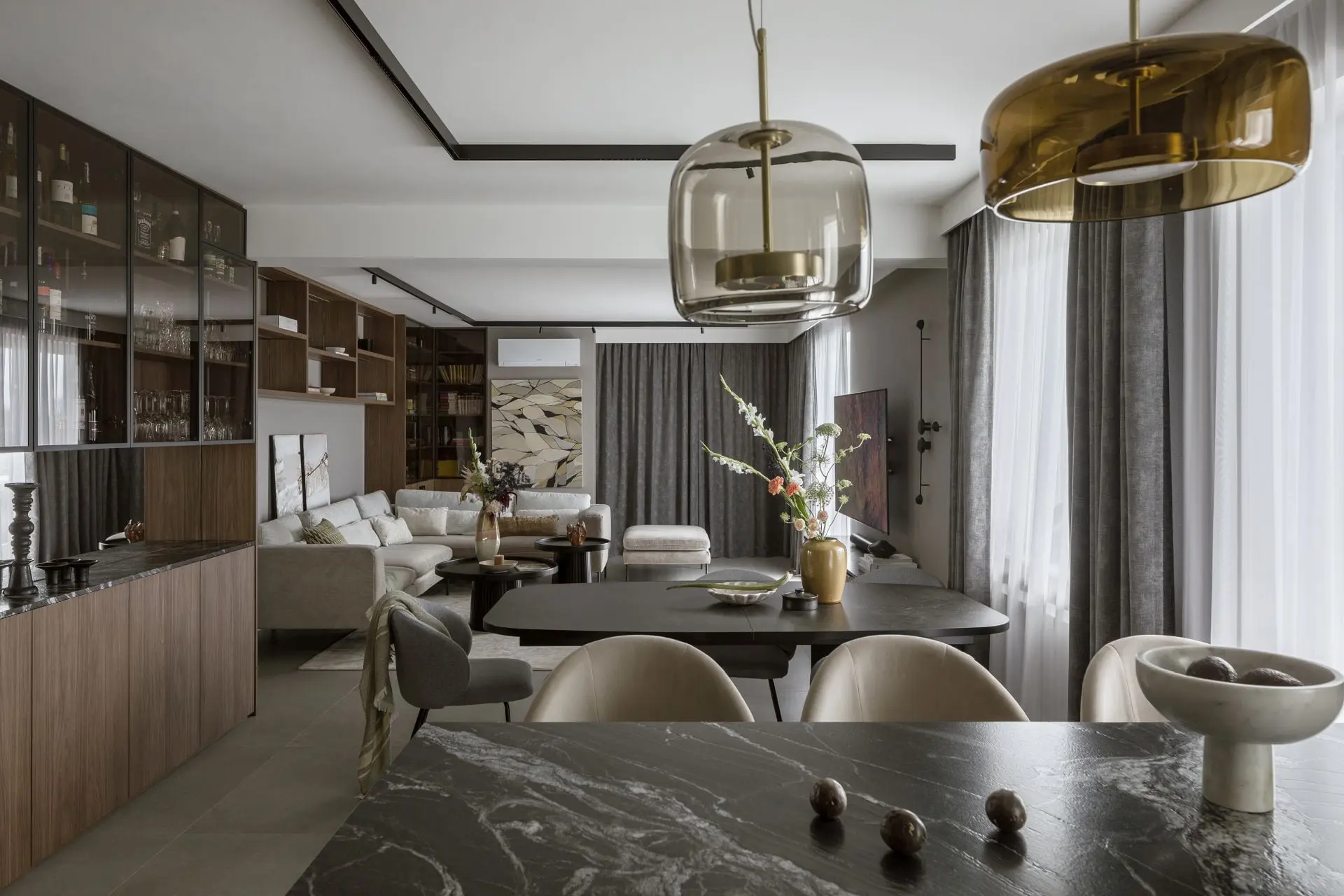 W części jadalnianej znajduje się elegancki barek, za którym znajdują się ekskluzywne alkohole. Mebel ten, jak wszystkie inne, został w 100% zaprojektowany przez Katarzynę Szostakowską. Tutaj  elementem dekoracyjnym jest także kamień Sensa Black Beauty Cosentino. To idealne miejsce do serwowania drinków w towarzystwie gości. Rodzinę hiszpańskich produktów z najwyższej półki użytych we wnętrzu uzupełniają lampy Aromas del Campo i Vibia. Projektantka, znana ze swojego wielkiego  zamiłowania do pięknego oświetlenia, użyła też ciekawych modeli włoskich mareki Marset.