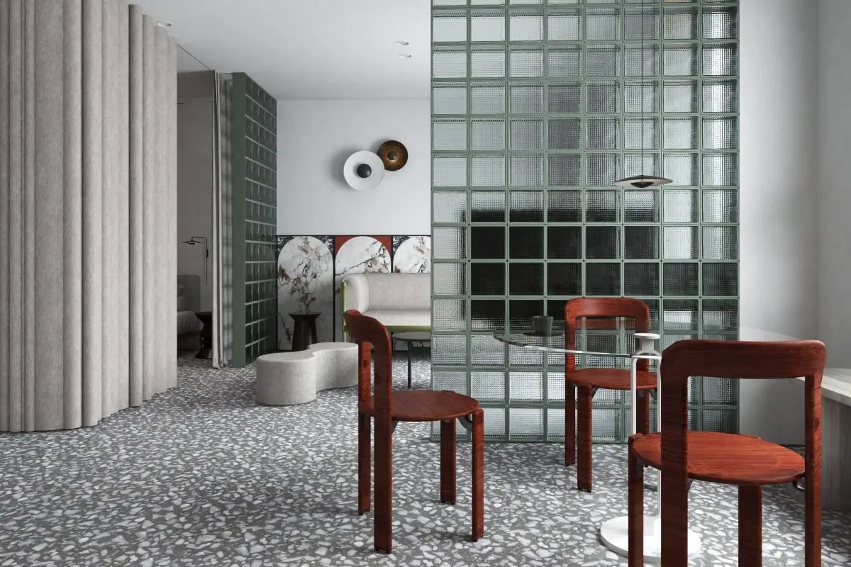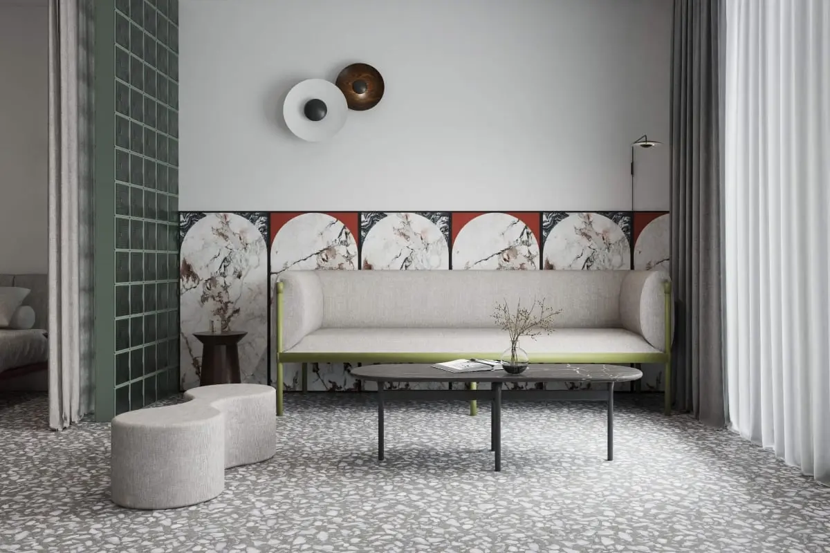 Monochromatyczne tło bieli i szarości przecinają detale w odcieniu bordo. Pojawiające się w nieoczywistych sytuacjach i niewielkich akcentach, wieńczą aranżację wnętrza. Odcień dojrzałej wiśni znajdziemy na marmurowej lamperii w strefie dziennej, ramie łóżka oraz w mocnych geometrycznych wzorach w łazience. Nawet wybrane przez ohe archteam elementy drewniane mają wybarwienie wpadające w czerwone tony, a marmurowe tekstury czerwone żyły. Po wnikliwszym spojrzeniu na koncept wnętrza, znajdziemy w nim jeszcze jeden barwny akcent. Jest nim zieleń, która pojawia się w marmurowym „pawim oku” nad blatem roboczym aneksu kuchennego, ramie sofy, a także szklanych luksferach.