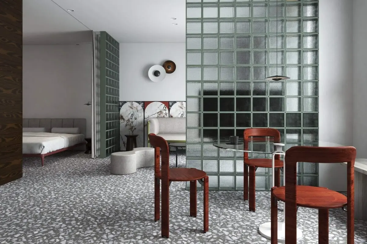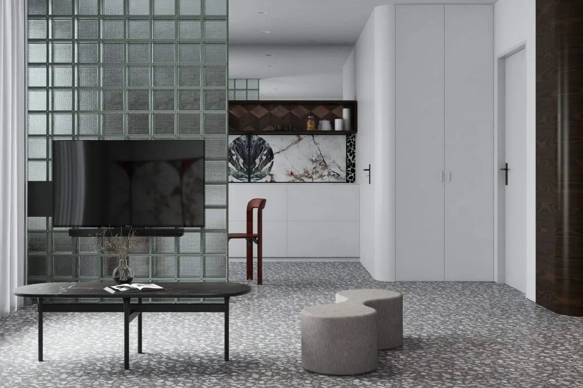 Zespół ohe archteam podkreśla, że projekt mieszkania o powierzchni 38m2, wymagał odpowiedniego doboru materiałów, które umożliwiłyby zwiększenie jego funkcjonalności przy zastanych warunkach oświetleniowych. Za sprawą szklanych pustaków, czyli popularnych w latach 80 luksferów, udało się wygospodarować trzy odrębne strefy funkcjonalne: kuchnię, część dzienną i sypialnię z zabudową pełniącą funkcję garderoby. Użycie szklanych przepierzeń zapewniło dobry transfer światła dziennego do wszystkich części mieszkania, pomimo iż mieszkanie ma jedynie dwa okna.