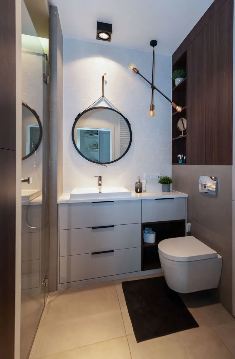 Nawet jeśli mamy mały metraż, warto postawić na dobrej jakości wyposażenie. W tej niewielkiej łazience znajdziemy portugalskie płytki marki Natucer (w strefie umywalkowej) a także miskę wc zaprojektowaną przez Starcka dla Duravita. Te i inne produkty do urządzenia mieszkania, architekt zamówiła w naszym showroomie.