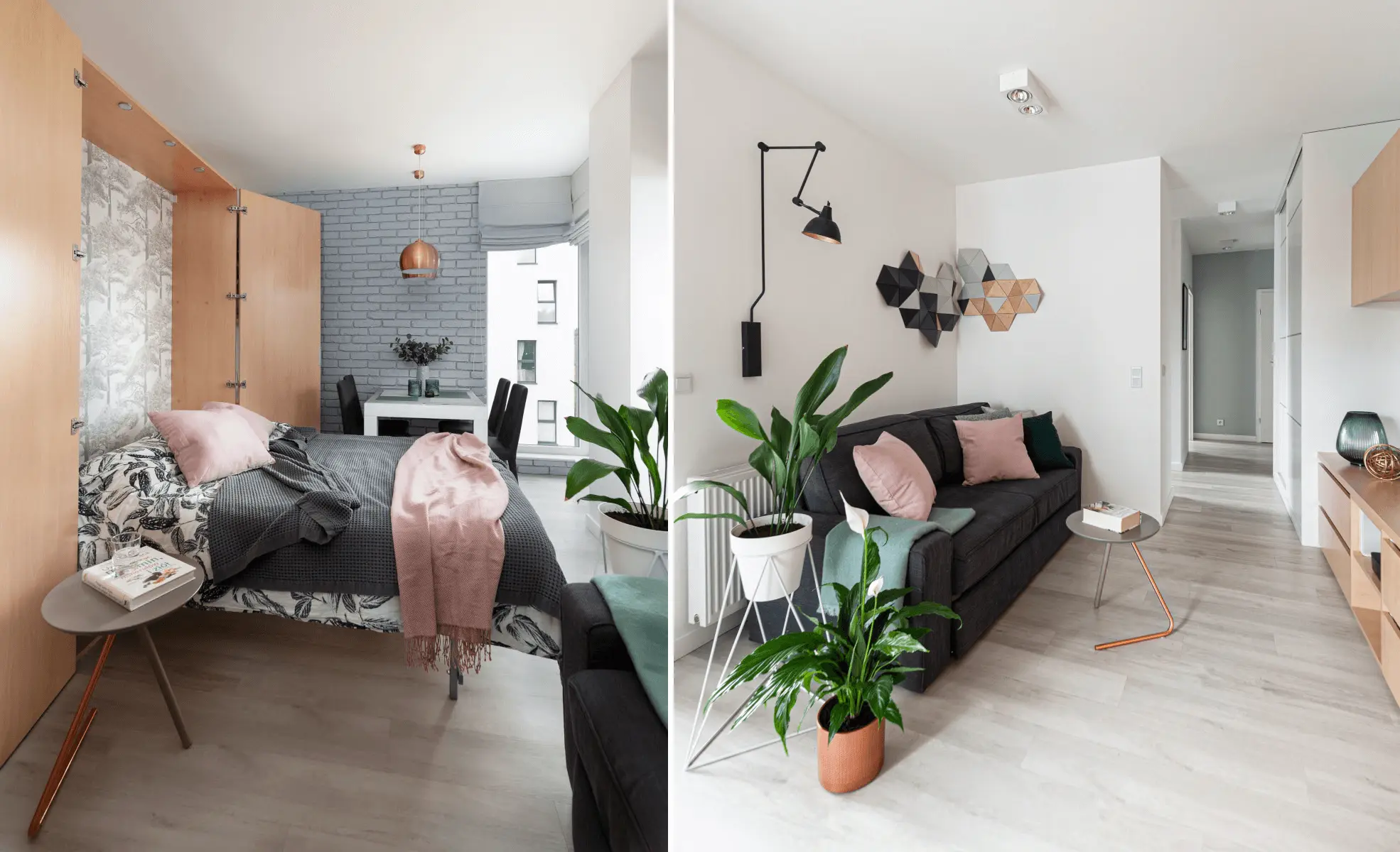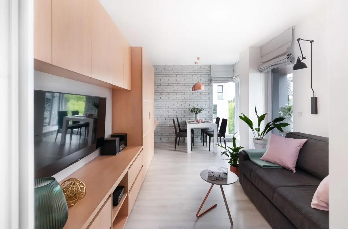 W projekcie przeważają stonowane barwy oscylujące pomiędzy bielą i szarością. Aranżację ociepla drewno a także pastelowe dodatki. W całym mieszkaniu znajduje się oświetlenie punktowe, które doskonale sprawdza się przy mniejszym metrażu. Na podłodze zastosowano winylowy panel, na który klienci zdecydowali się ze względu na to, że mniej się rysuje niż drewno i jest odporny na wodę. Dzięki temu można było bezpiecznie go położyć, i w kuchni, i w przedpokoju.