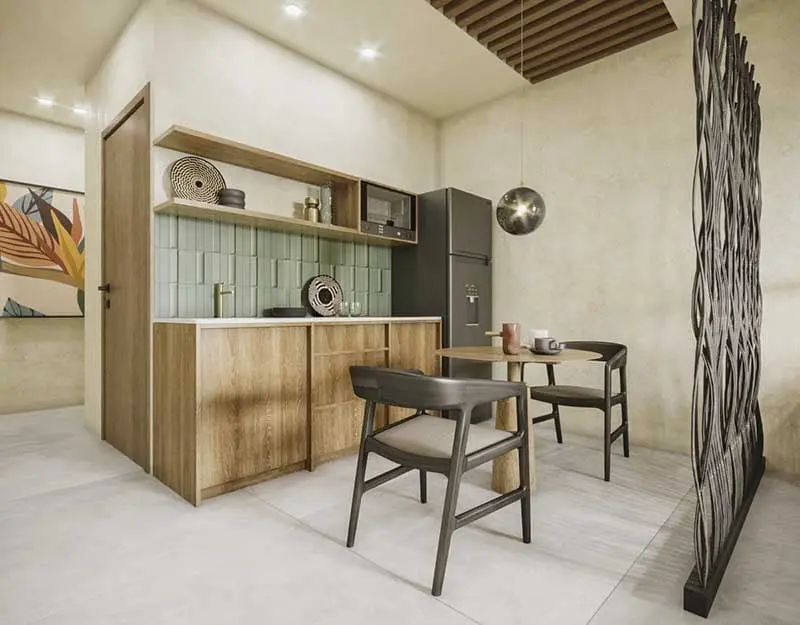 Podczas pracy nad tym projektem, architektom przyświecała idea połączenia nowoczesności i funkcjonalności rozwijającego się miasta z ciepłem i kolorami tropikalnej dżungli, która je otacza. W rezultacie udało się wykreować bardzo inspirującą przestrzeń, pełną surowych tekstur i naturalnych materiałów. Dodanie do niej nowoczesnej odsłony boho, dużej ilości zielonych elementów, żółtych akcentów oraz detali w postaci złota, nadało całości wyjątkowo oryginalnego charakteru. Dodatkowo jest tu bardzo dużo ciekawych rozwiązań, które mogą zainteresować każdego, kto szuka pomysłów dla własnego zielonego mieszkania.