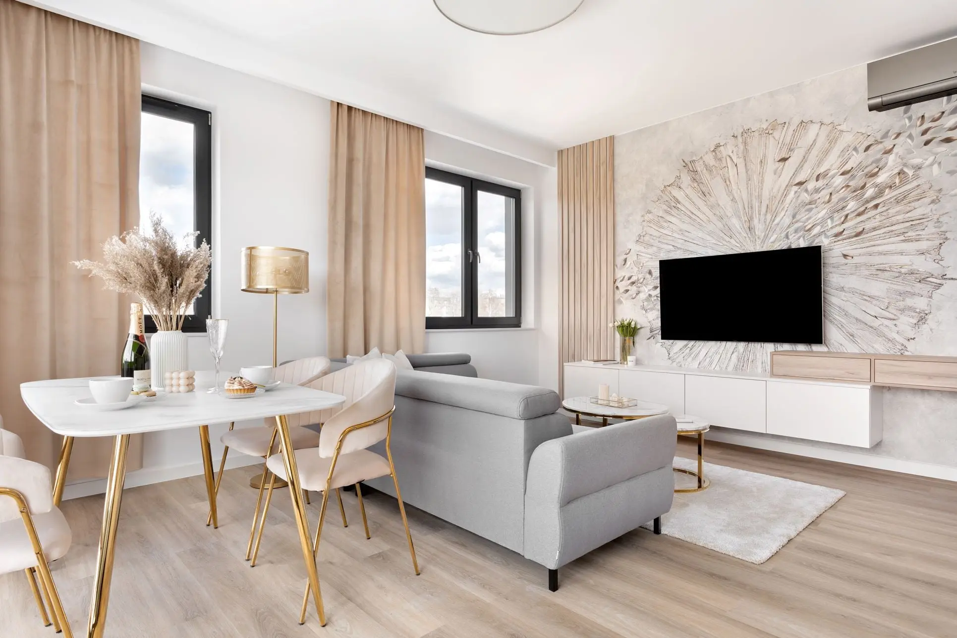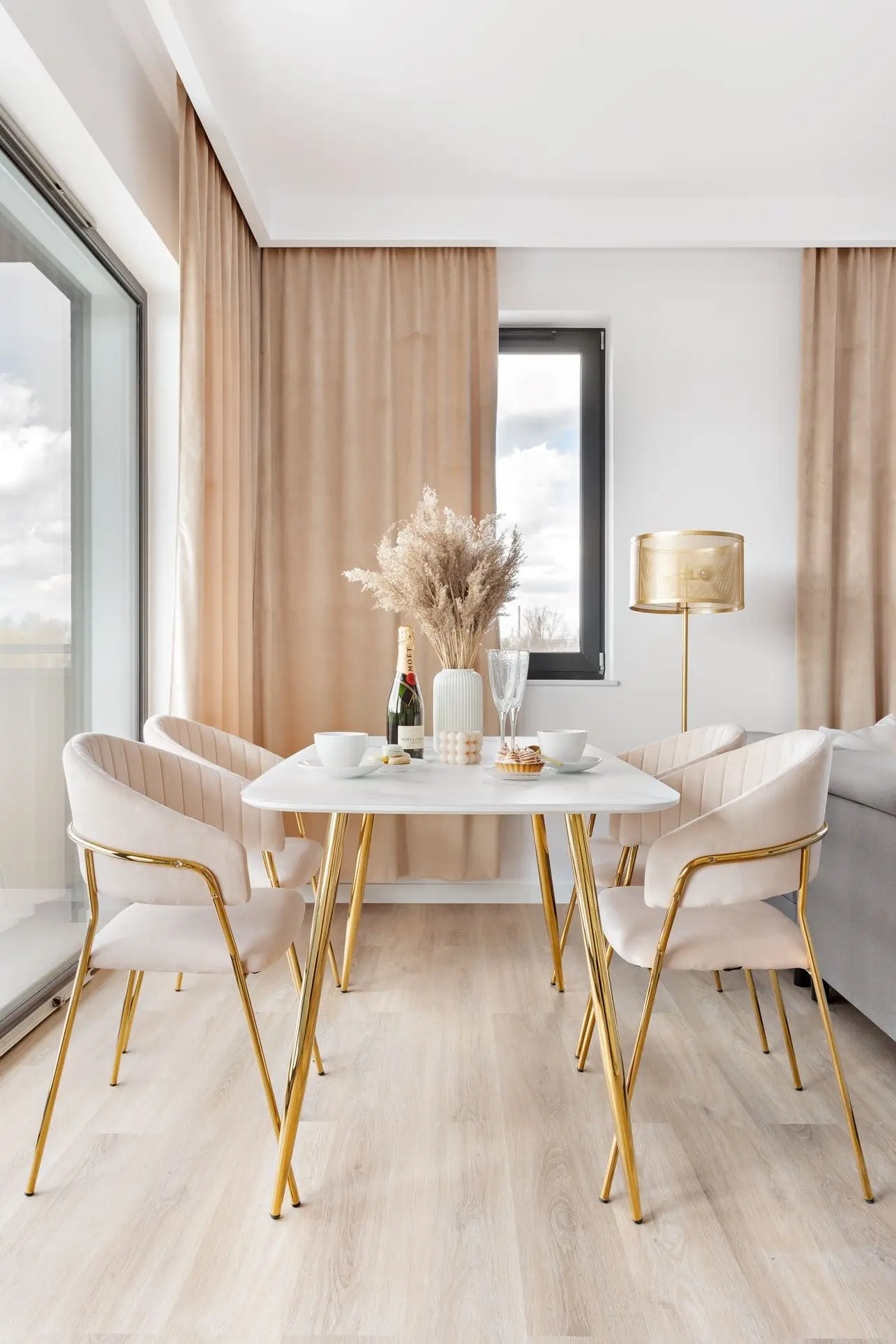 Elementy złota oraz marmuru konsekwentnie przeplatają się w całym mieszkaniu tworzy to harmonijne i spójne wnętrze. Złoto i marmur są luksusowymi materiałami, które mogą dodać elegancji i prestiżu wnętrzu.