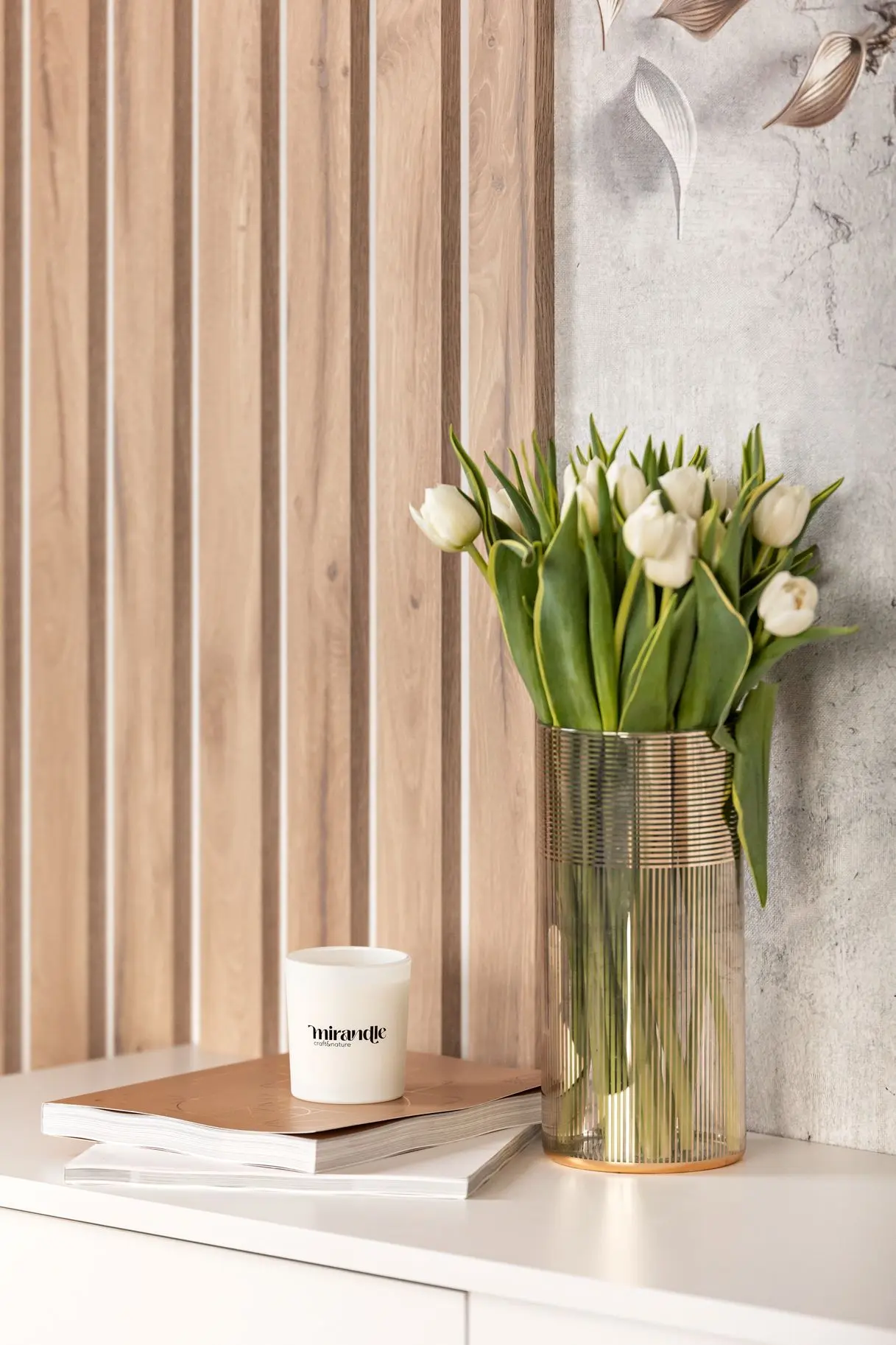Doskonałym sposobem na dodanie charakteru i stylu do przestrzeni salonu, strefy relaksu jest tapeta, która z lamelami tworzy ciekawą kompozycję aranżacyjną. Jej delikatny wzór nie zakłóca harmonii wnętrza. W dziennej strefie znajduję się również komfortowy narożnik oraz stół z marmurowym blatem na złotych nogach.