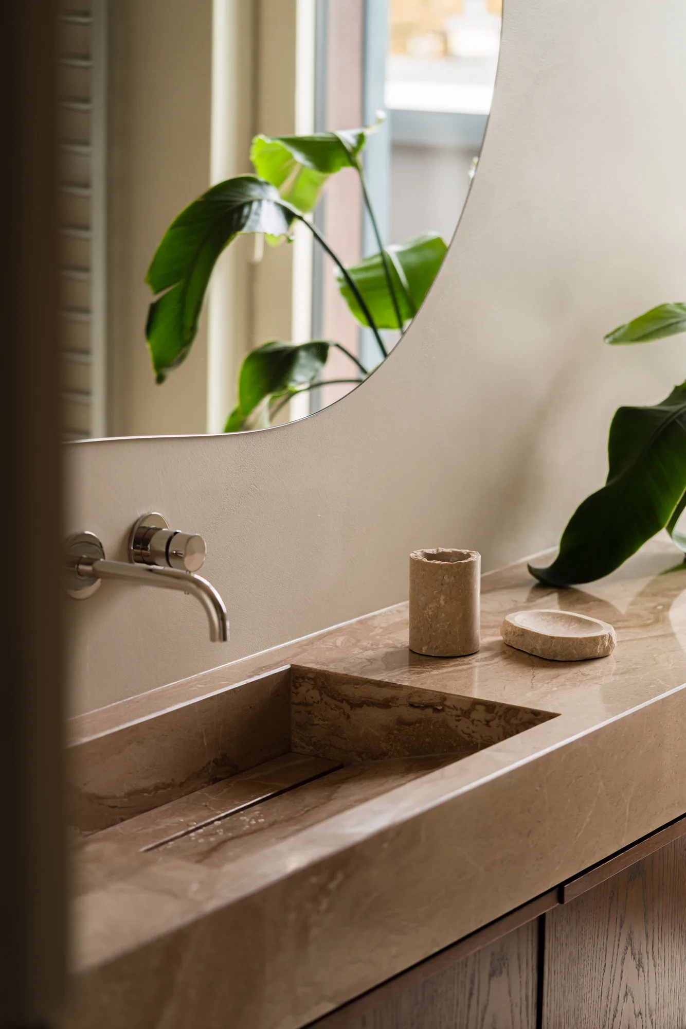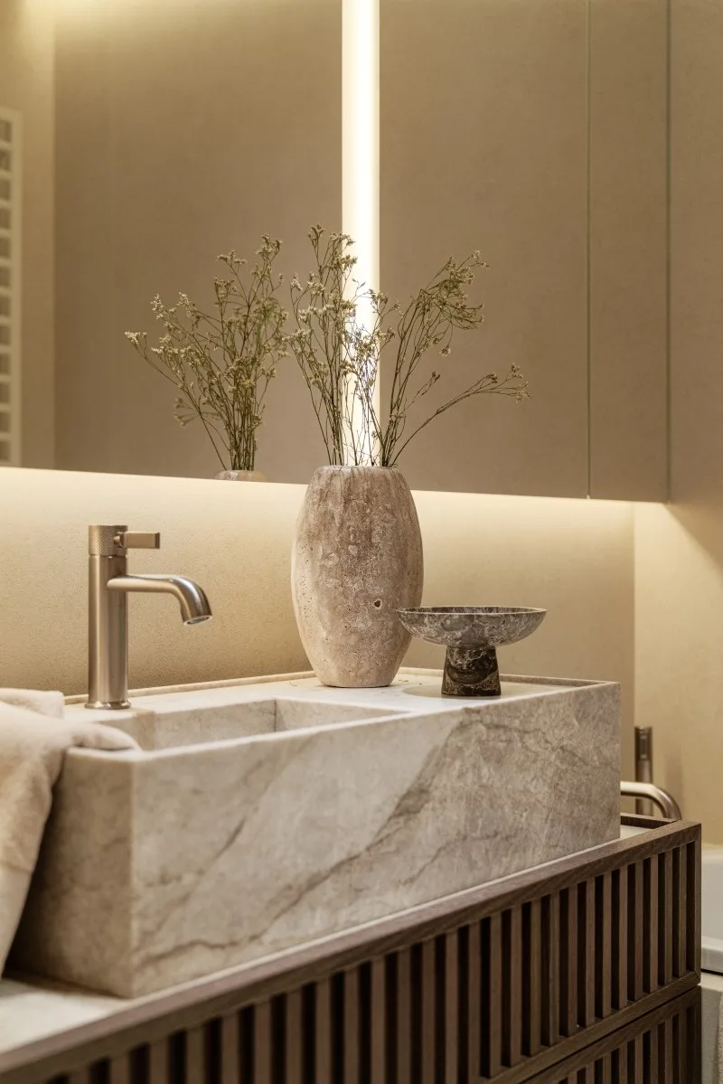 Całość dopełnią organiczne formy, na przykład w postaci luster o amorficznych kształtach, zaoblonych szafek podumywalkowych czy rzeźbiarskich form zastosowanych w sposób użytkowy.