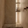 Następnym bardzo ważnym krokiem w aranżacji łazienki jest dobór faktur i tekstur. W 2026 roku na ścianach i podłogach będą królowały matowe płytki z wyraźną teksturą, inspirowaną niedoskonałością natury. Szorstkość kamienia zawsze możemy zrównoważyć miękkością tkaniny, uzyskując idealną harmonię sprzyjającą relaksowi.