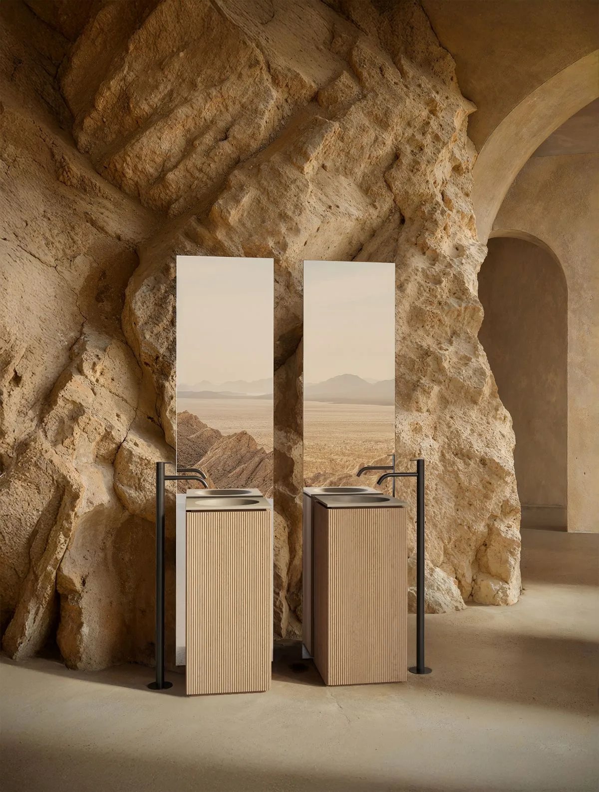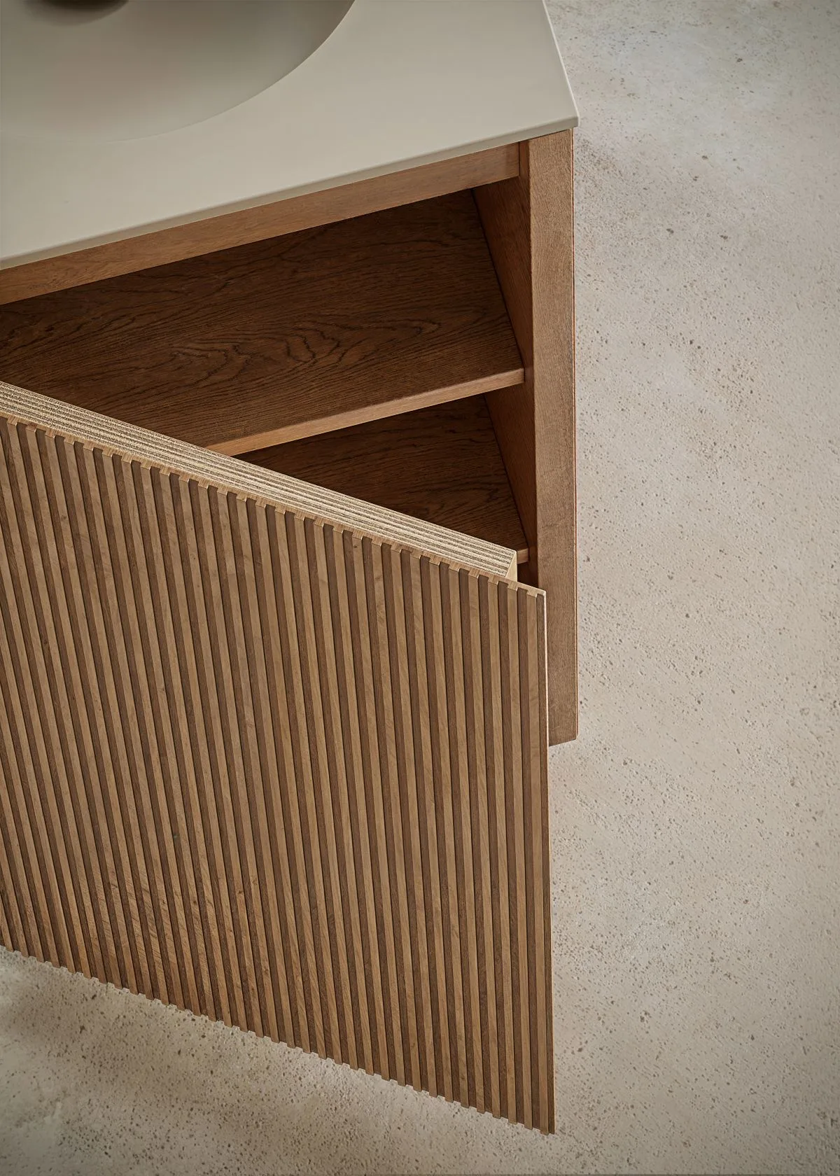 Cechą charakterystyczną kolekcji Grate są powtarzalne linie, które tworzą wizualny rytm – niczym architektoniczna melodia, w której światło tańczy z cieniem. To właśnie ten subtelny dialog faktury i światła wnosi do przestrzeni łazienkowej głębię i nowoczesny artyzm.