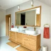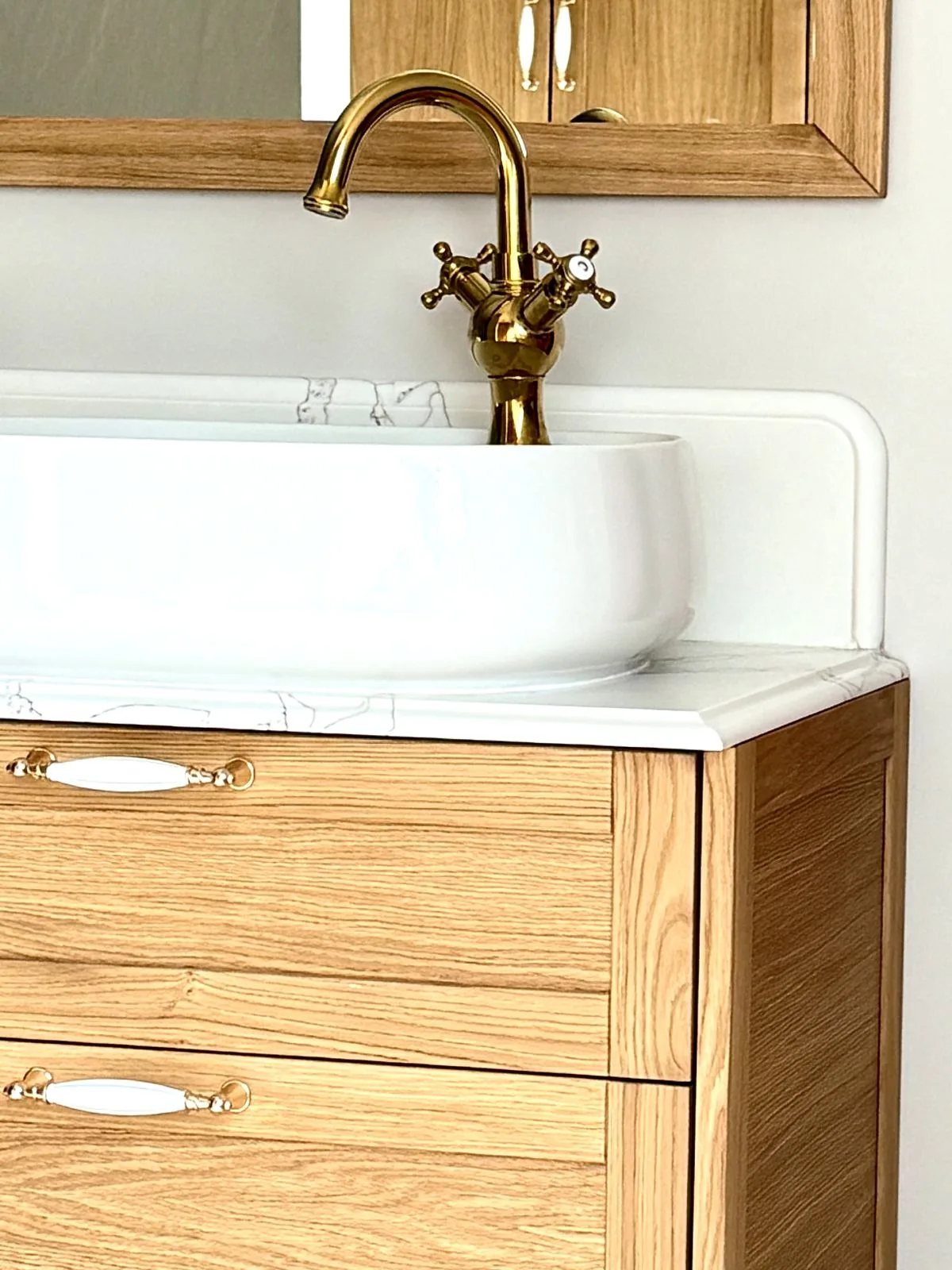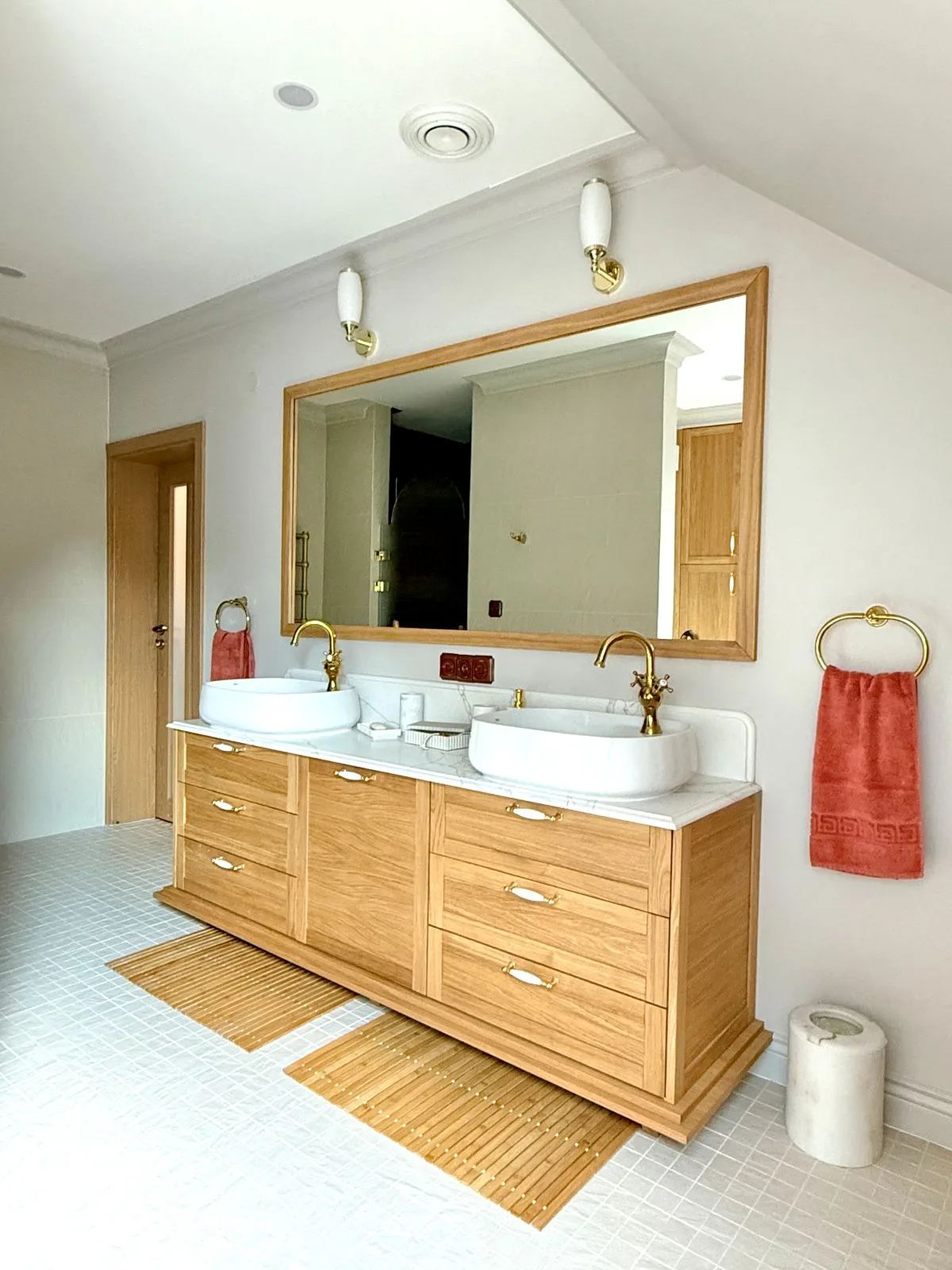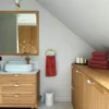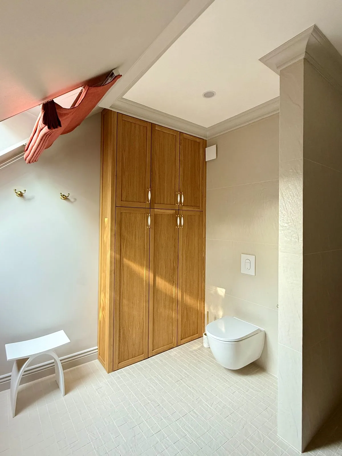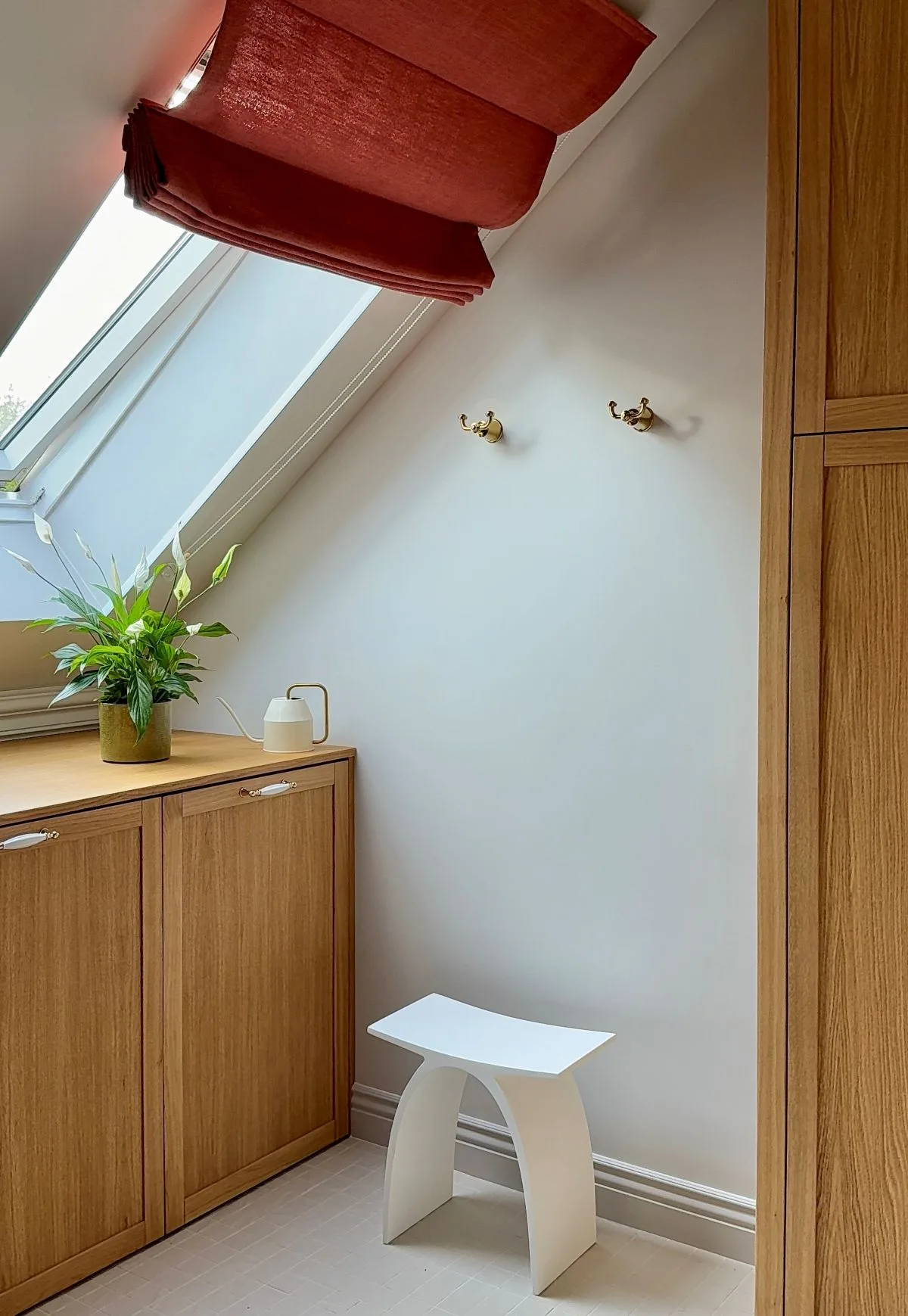 Kamienny blat, piękny dziś i piękny za dekadę, podkreśla trwałość i ponadczasowość całego projektu. Duże lustro odbija światło i sylwetkę z wdziękiem, subtelnie powiększając przestrzeń i dodając jej lekkości. Zabudowa pod skosem sprytnie ukrywa pralkę, suszarkę oraz zapasy, jednocześnie oferując wygodny blat roboczy, który ułatwia codzienne obowiązki.