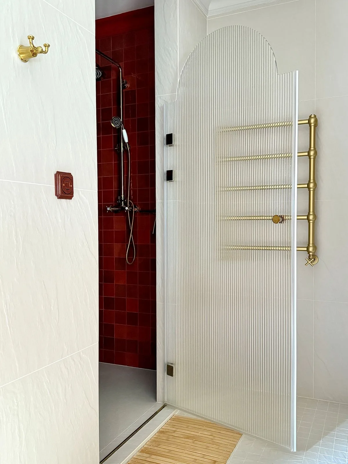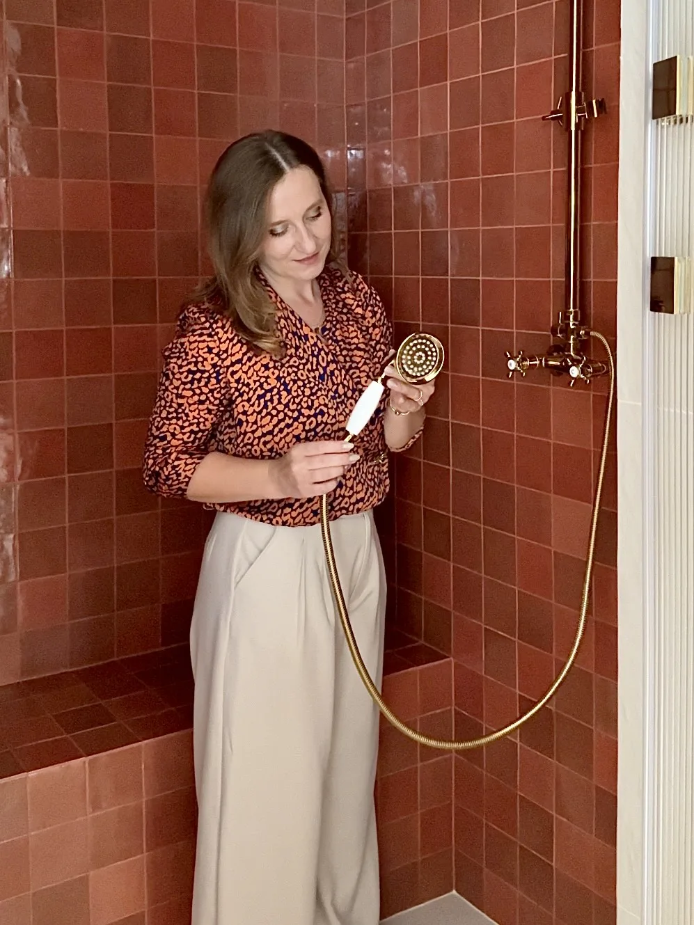 Inwestorzy byli pewni jednego: rezygnacja z wanny. Architektka, z wyczuciem łącząc ich decyzję z intuicją, że czasem mogą za nią zatęsknić, zaprojektowała obszerną strefę prysznicową – z wygodnym siedziskiem, deszczownicą i szeroką półką na kosmetyki. Serce tego miejsca bije w rytmie terakotowych płytek Marazzi, które wniosły do jasnej przestrzeni ciepło i równowagę, idealnie korespondując z paletą całego domu.