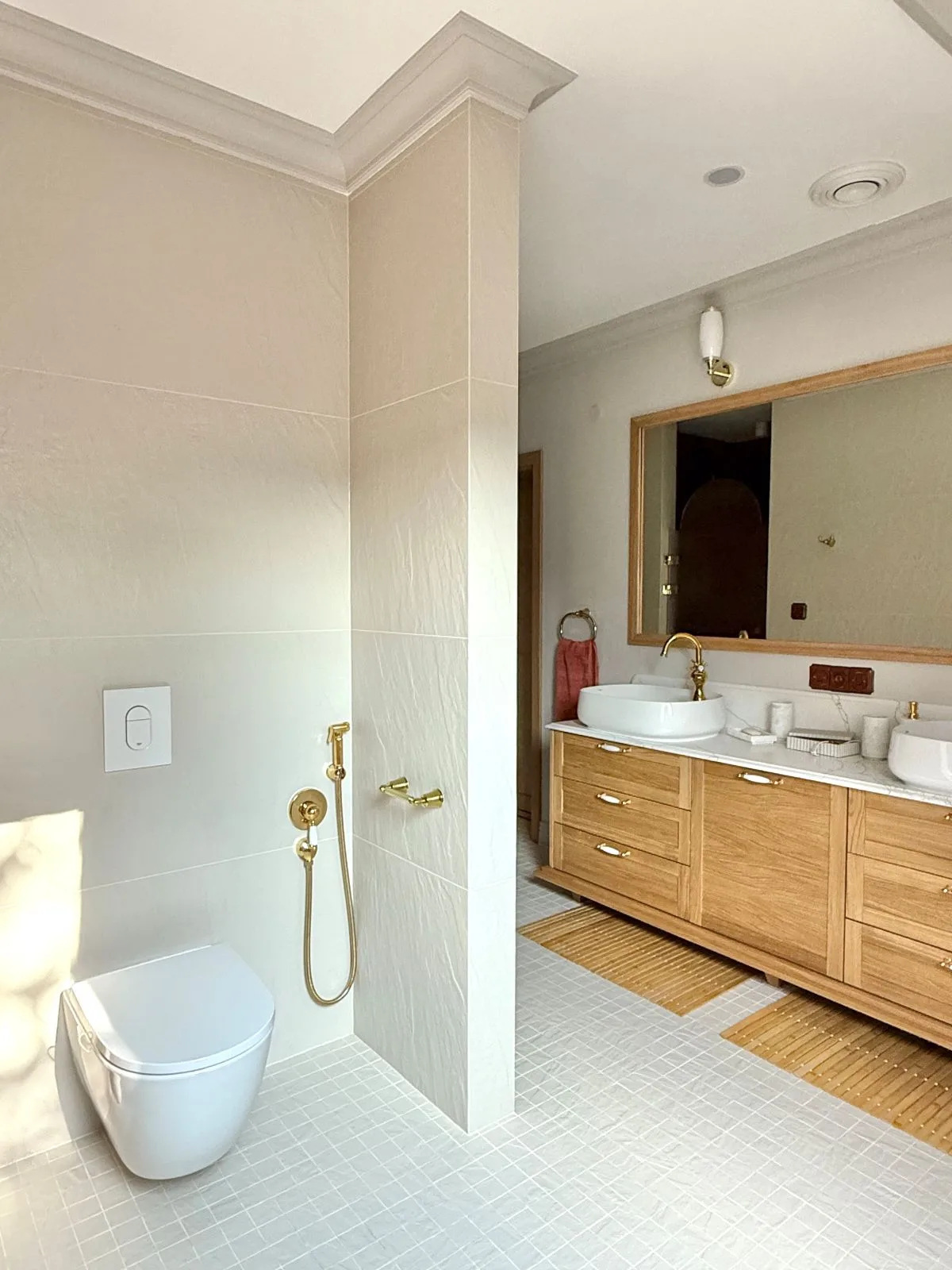 Wysoka zabudowa meblowa okazuje się nie tylko eleganckim akcentem, lecz także praktycznym schowkiem na suszarkę do ubrań, szlafroki czy domowe zapasy. Dyskretna bidetka staje się niepozornym, lecz niezastąpionym elementem, a delikatnie wydłużona ścianka oddzielająca strefę WC to prosty, a zarazem niezwykle istotny gest w stronę intymności i komfortu.
