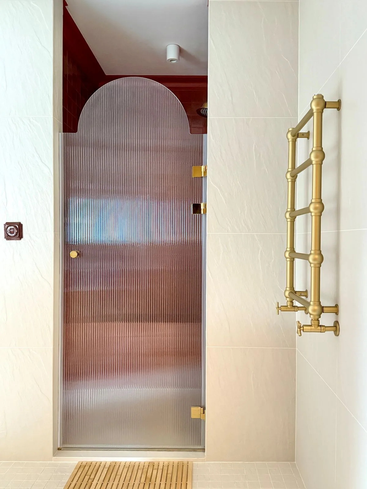 Dom utrzymany w duchu naturalnych materiałów, klasycznych detali i szlachetnych struktur znalazł w tej łazience naturalną kontynuację. Na ścianach i w mozaice podłogowej pojawił się gres o strukturze kamienia, który wprowadził spokój i ponadczasową spójność.