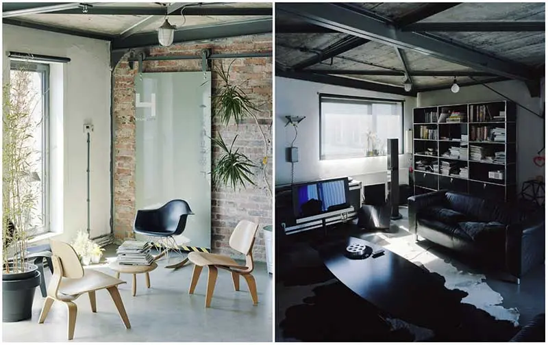 Styl loft cechuje duża surowość wnętrza, tak jest i w tym przypadku – drzwi bez klamek, ściany bez kafelek w łazienkach, wylewna posadzka z żywicy epoksydowej na podłodze. Jednocześnie wśród bardzo pospolitych i garażowych mebli oraz wykończeń, spotkać można ikony dizajnu i wysmakowane meble, które tworzą w tym wnętrzu harmonijną całość.