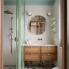 Oświetlenie w tym kontekście przestaje pełnić wyłącznie rolę praktycznego narzędzia, lecz staje się elementem budującym atmosferę spokoju i intymności. Światło nie jest intensywne ani jednolite, lecz rozproszone, przytłumione, delikatnie płynące z różnych zakamarków wnętrza, podkreślające strukturę materiałów i subtelne refleksy na powierzchniach. W dzień kluczowe staje się światło naturalne – wpadające przez duże przeszklenia, filtrowane przez lekkie zasłony, odbijające się w lustrach i subtelnie otulające wnętrze swoją zmieniającą się dynamiką. Wieczorami przestrzeń wypełniają ciepłe refleksy pochodzące z lamp o organicznych kształtach, inspirowanych tradycyjnymi formami rękodzieła, których mleczne abażury łagodnie rozpraszają blask, tworząc aurę sprzyjającą wyciszeniu.