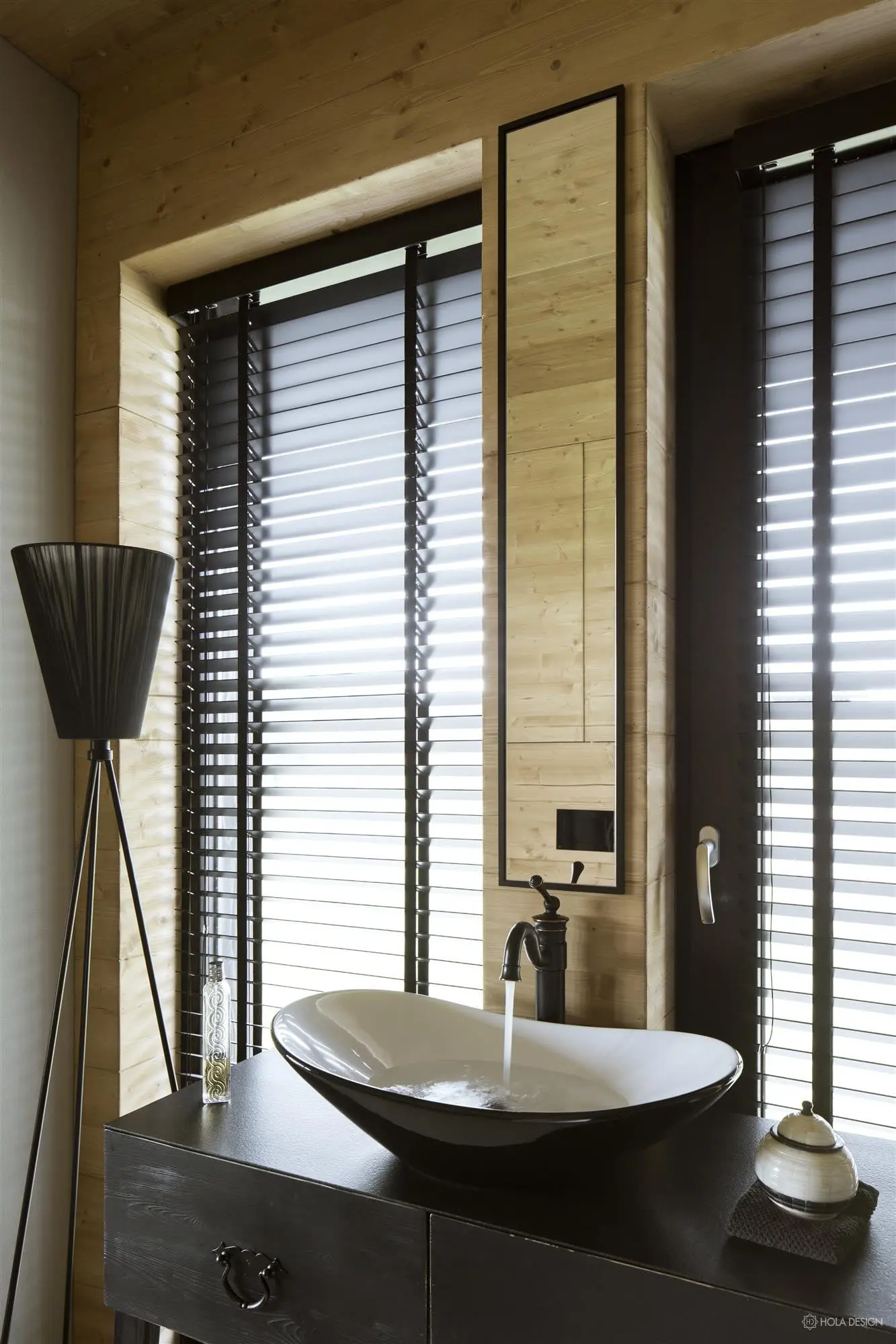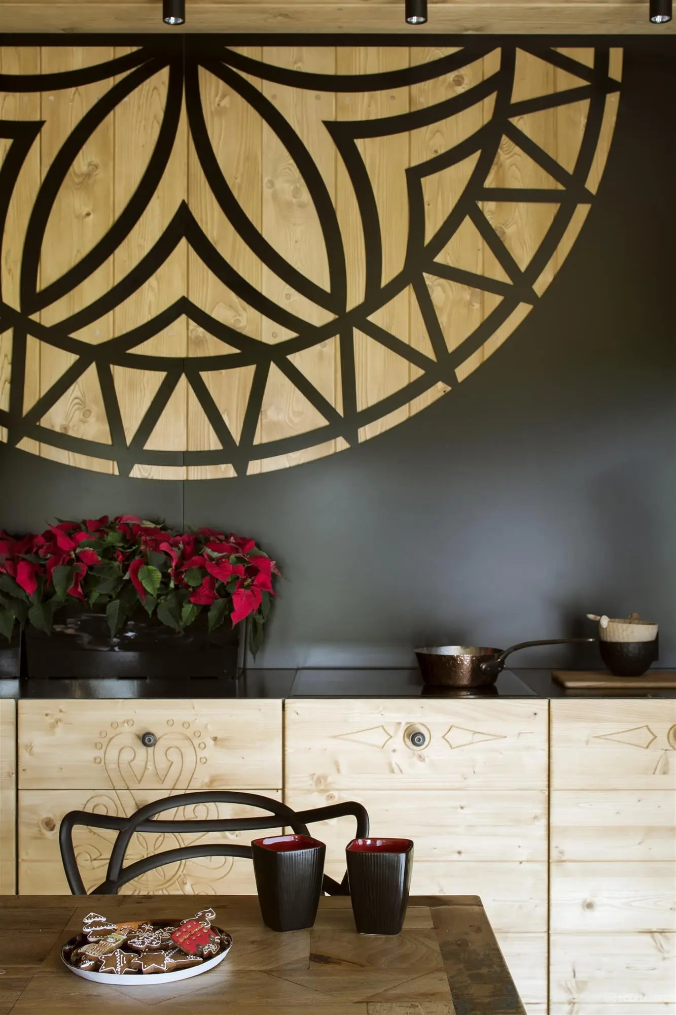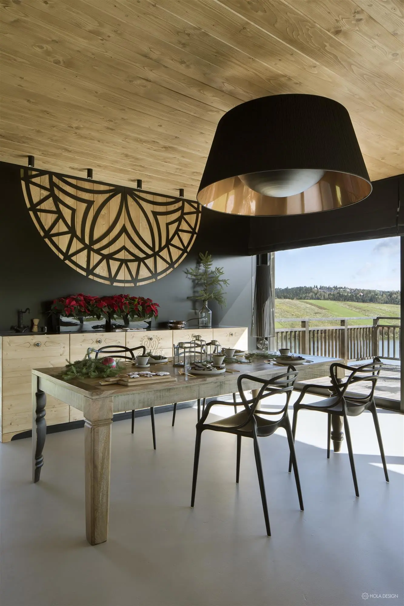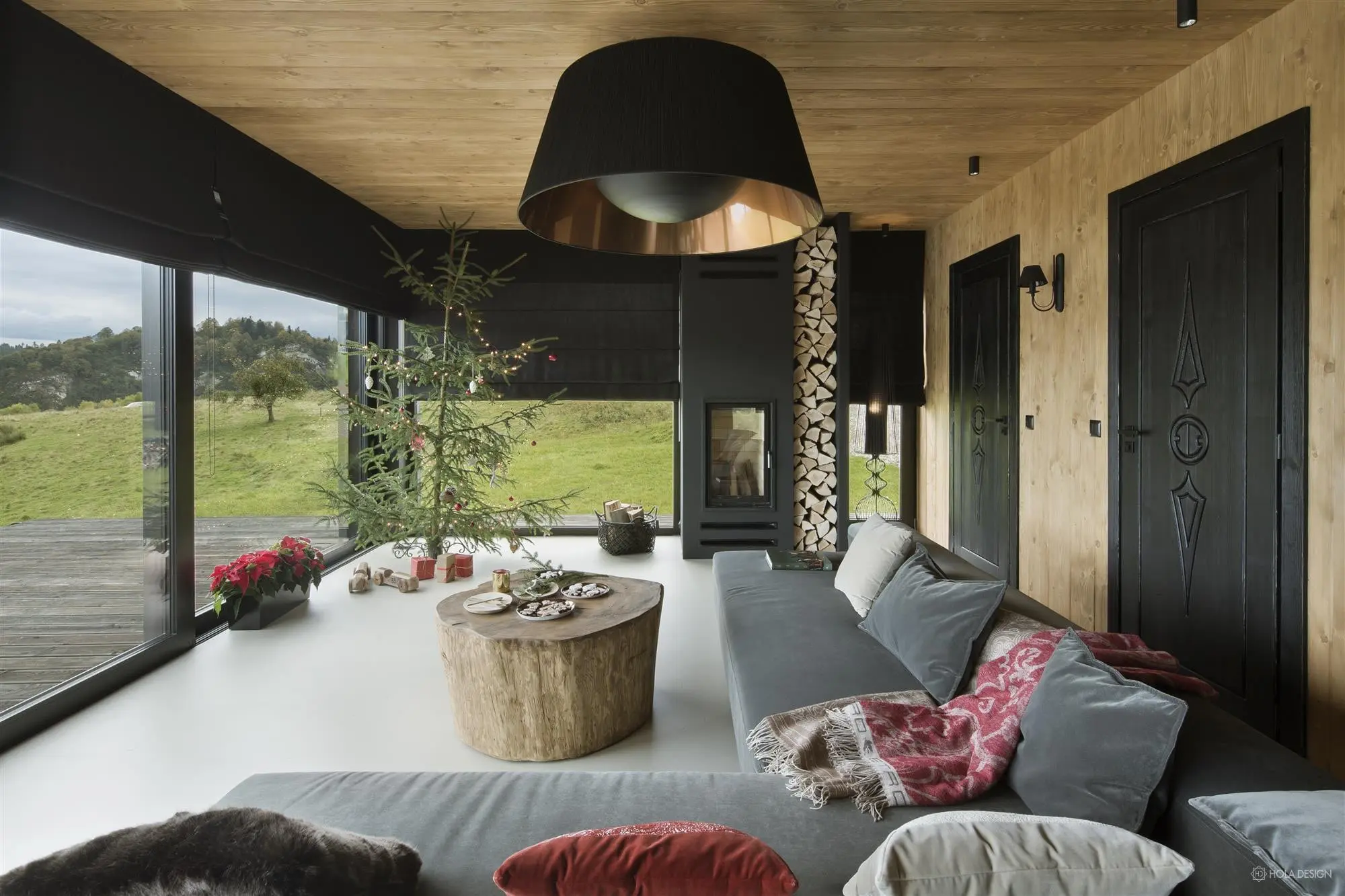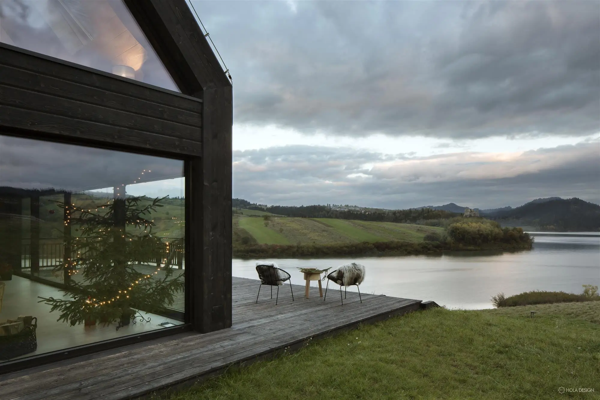 Dom w stylu górskiej chaty z widokiem na Jezioro Czorsztyńskie i Pieniny, jest wykończony prawie w całości drewnem. Nie zabrakło również folkowych odniesień – na komodzie pojawił się motyw parzenicy. Dzięki ogromnym przeszkleniom, piękny krajobraz przyrody znajduje się na wyciągnięcie ręki. Możemy go podziwiać z dużego narożnika, który stanowi centrum mieszkania.