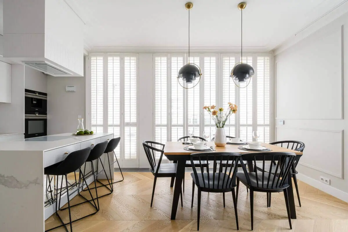 Nowoczesny sznyt mieszkanie zyskuje dzięki ścianie wykonanej z shuttersów. Jak wspomina arch. Zofia Pisarska, była ona jednym z największych wyzwań w tym projekcie. Bądź co bądź, okazała się świetnym rozwiązaniem. Nie dość, że sama w sobie jest bardzo dekoracyjna, to jeszcze zasłania niezbyt przyjemny widok z okna. Dodatkowe efekty wizualne czyni światło próbujące się dostać do wnętrza przez małe otwory w shuttersach.