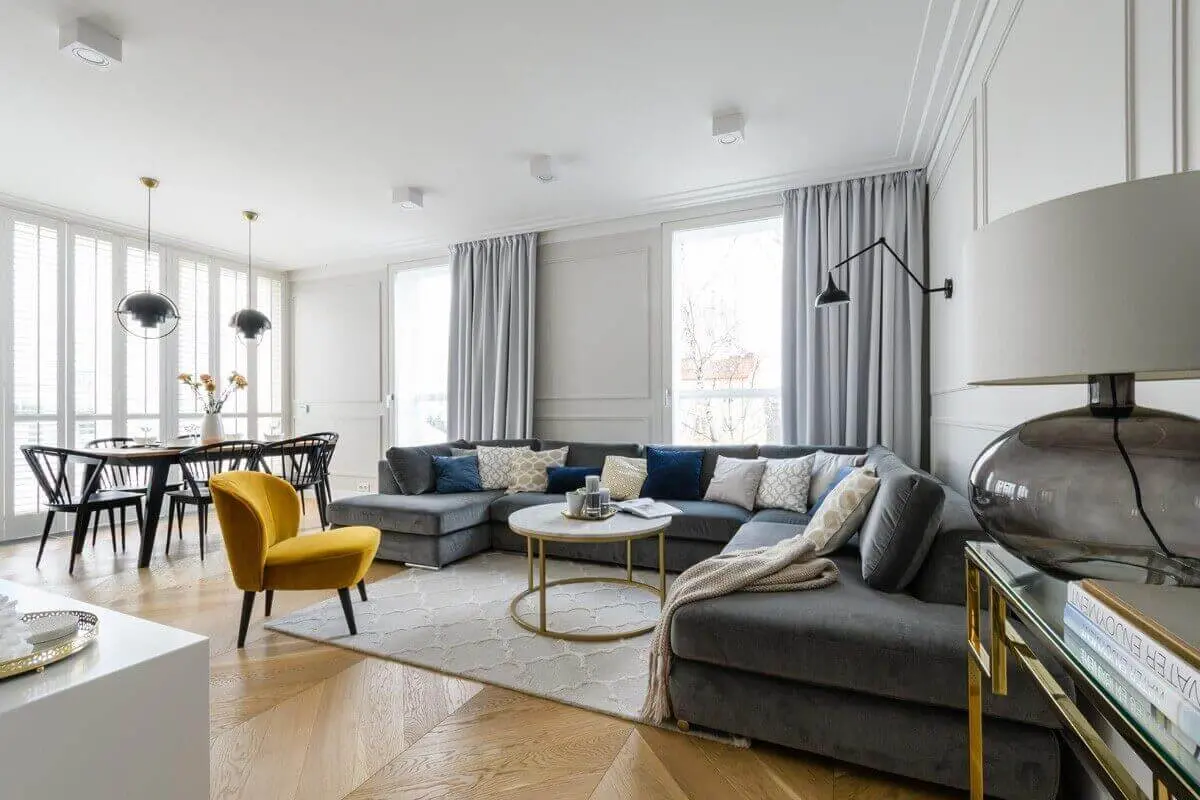 W aranżacji nie brakuje złotych detali. Wysokopołyskowe elementy sprawiają, że apartament zyskuje na eleganckim looku. Klasyczne odniesienia znajdziemy przede wszystkim w parkiecie ułożonym w jodełkę, obecnych sztukateriach oraz w marmurowych wykończeniach. Długie, ciężkie zasłony również nakierowują na zamiłowania estetyczne właścicieli mieszkania. Oprócz tego czynią wnętrze oazą przytulności, ale w bardzo wyrafinowanym wydaniu. Wisienką na torcie są dekoracyjne lampy i dywany.