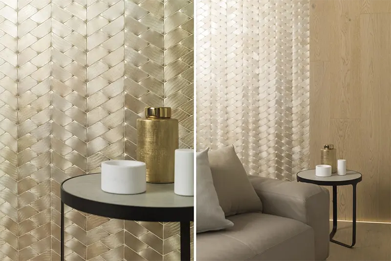Złote, lustrzane, grające ze światłem mozaiki, pełnią rolę swoistej biżuterii wnętrza. Propozycja marki Porcelanosa, wprowadza luksus to każdego wnętrza.