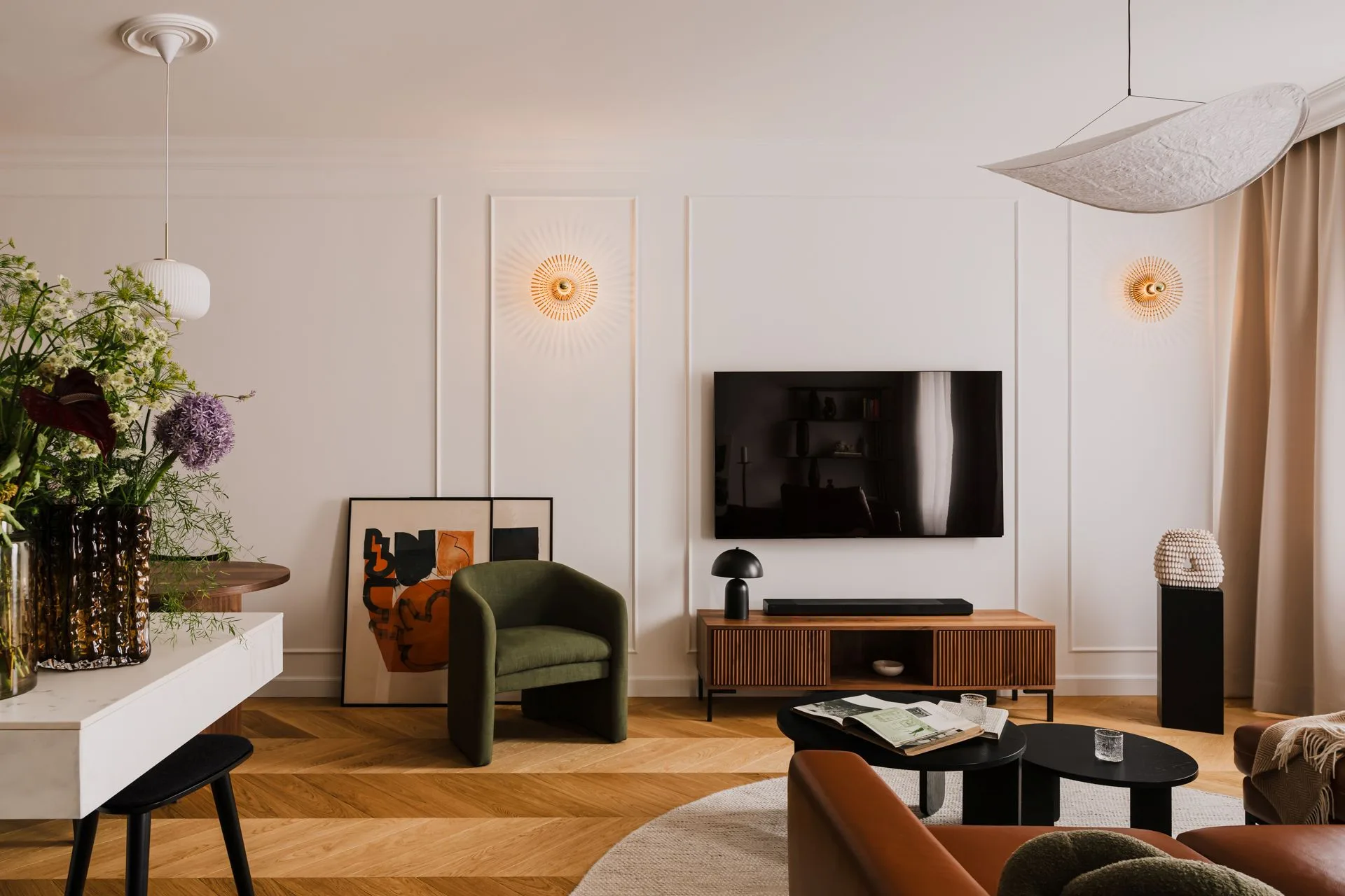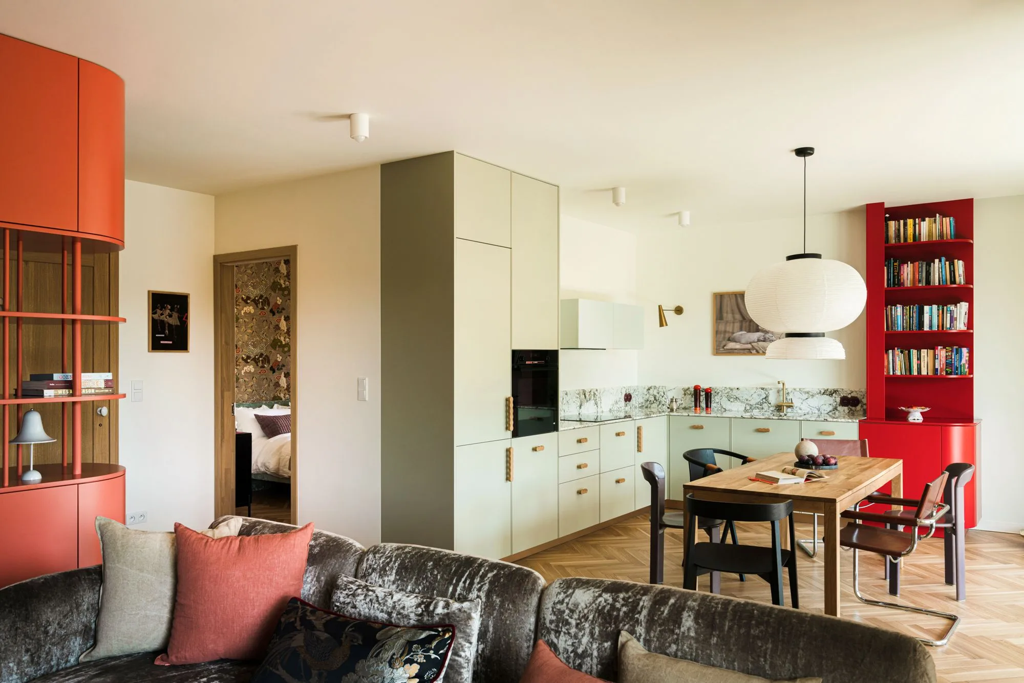 Kolejne połączenie barwne przenosi nas do powojennego modernizmu. Mieszkanie w kamienicy położonej w centrum Żoliborza to piękna opowieść o szacunku do historii i umiejętnym przełożeniu jej języka na współczesne realia.