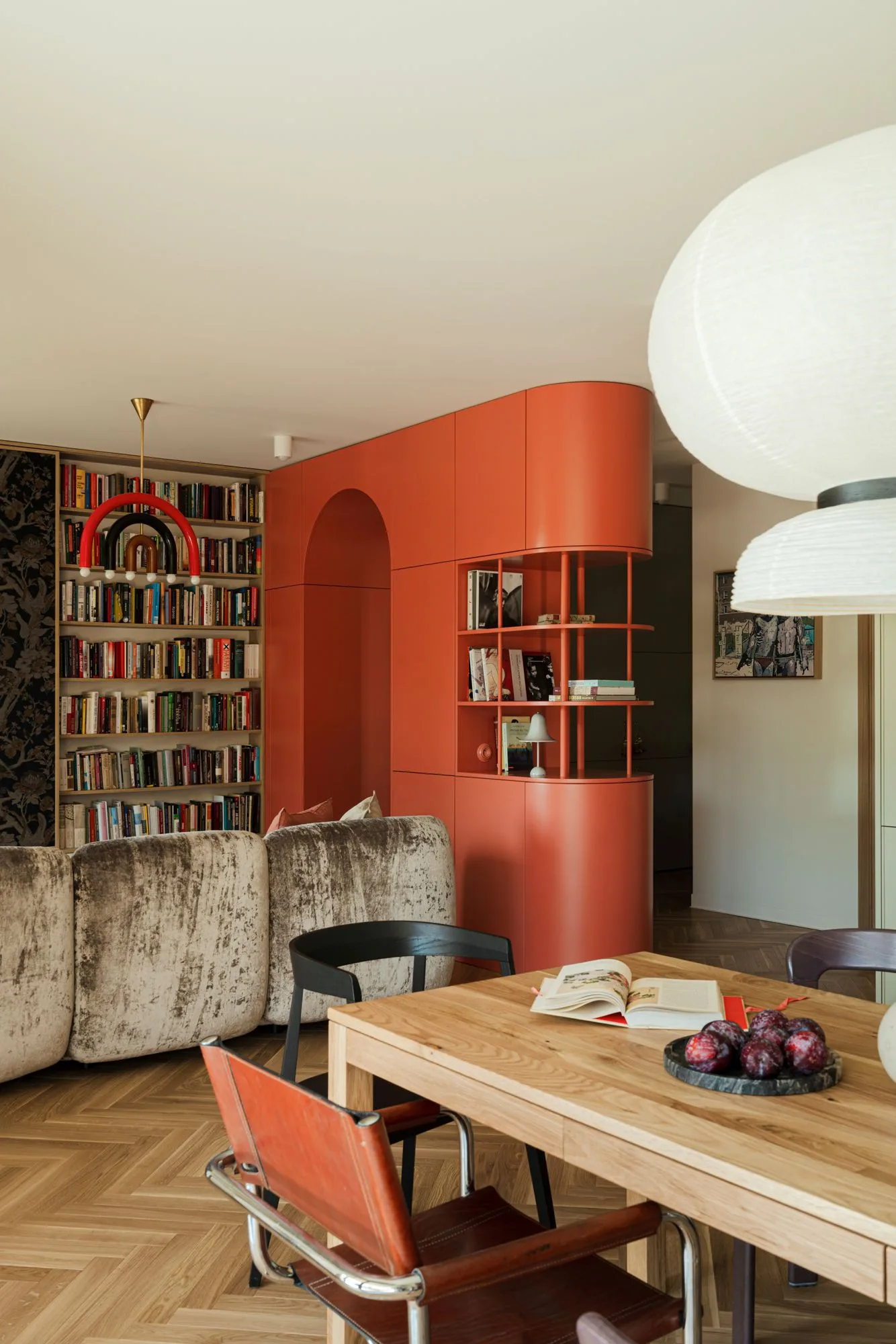 W tym wnętrzu, zaprojektowanym przez Monikę Michałowską, odnajdujemy subtelne nawiązania do sztuki Katsushiki Hokusaia. Zamiast jednak sięgać po jego najsłynniejsze pejzaże, projektantka zwróciła na mniej oczywiste prace artysty, czerpiąc z nich paletę barw i motywy. Czerwienie, zielenie, róże i szarości stały się kolorystyczną dominantą mieszkania, nadając mu wyjątkowy charakter.