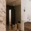 Ta niezwykle kojąca i pełna głębi barwa wnosi do przestrzeni elegancję porównywalną z czernią, lecz w znacznie bardziej przystępny, niezobowiązujący sposób. Dodatkowo tworzy ,,miękkie”, bardziej harmonijne połączenia z innymi kolorami. W tej realizacji architekci zestawili brąz ze zgaszoną zielenią, a ten piękny duet dopełnili kroplą szlachetnego bordo – odcienia, które również zyskuje na popularności. Wysublimowany charakter dopełniają starannie dobrane materiały: kamień, drewno, skóra i szkło.