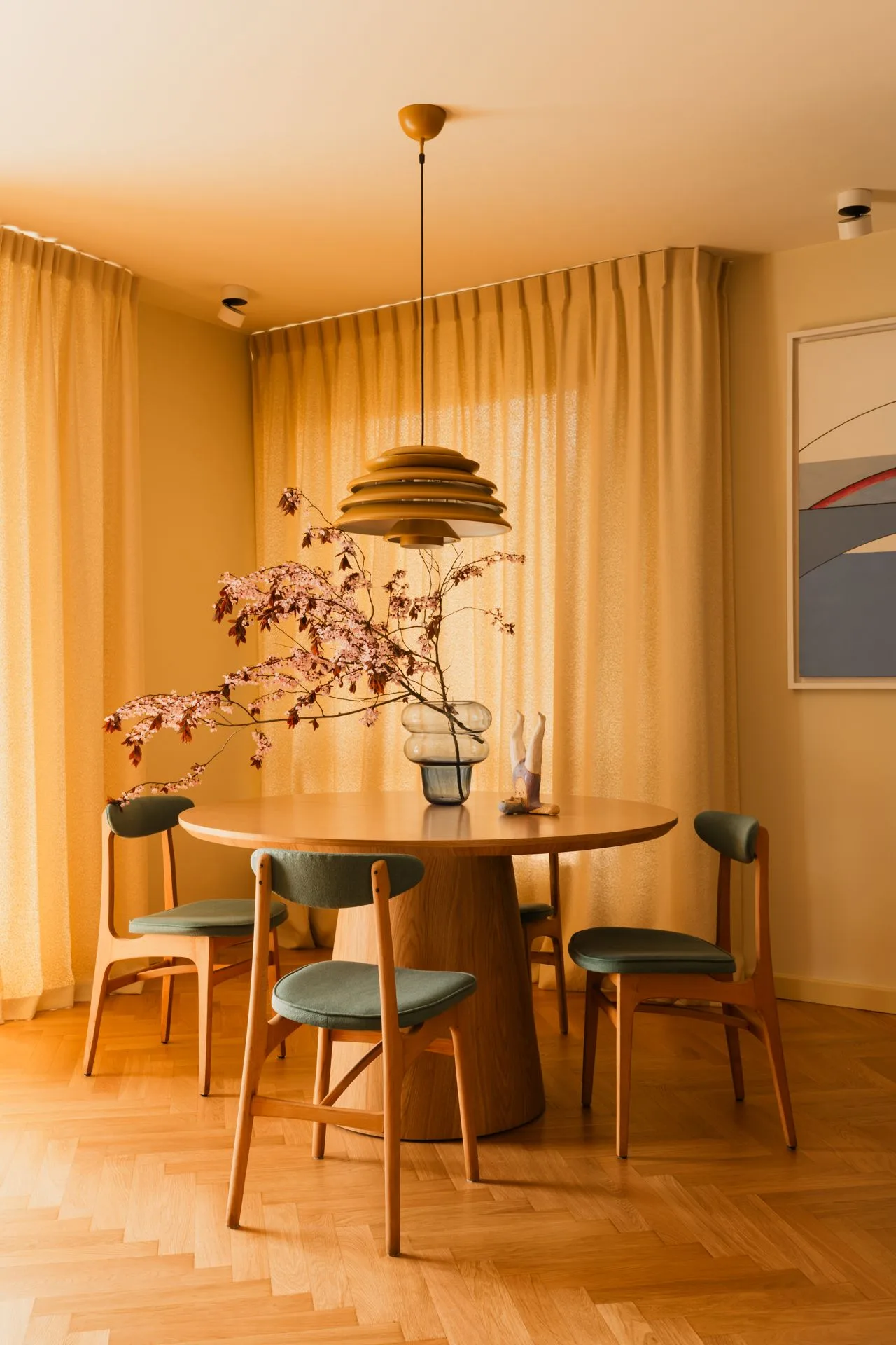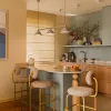 W tym wnętrzu pojawia się wyjątkowo modny kolor roku 2025 – masełkowy żółty, który latem królował w modowych stylizacjach. Jak się okazuje, we wnętrzach również sprawdza się doskonale: stanowi niebanalną bazę oraz łatwo łączy się z innymi tonacjami. W tym projekcie architekci zestawili go z błękitem oraz pastelową szarością. Całość tworzy harmonijną kompozycję, której charakter podkreślają meble w stylu mid-century modern, doskonale wpisujące się w ciepłą kolorystykę całego apartamentu.