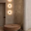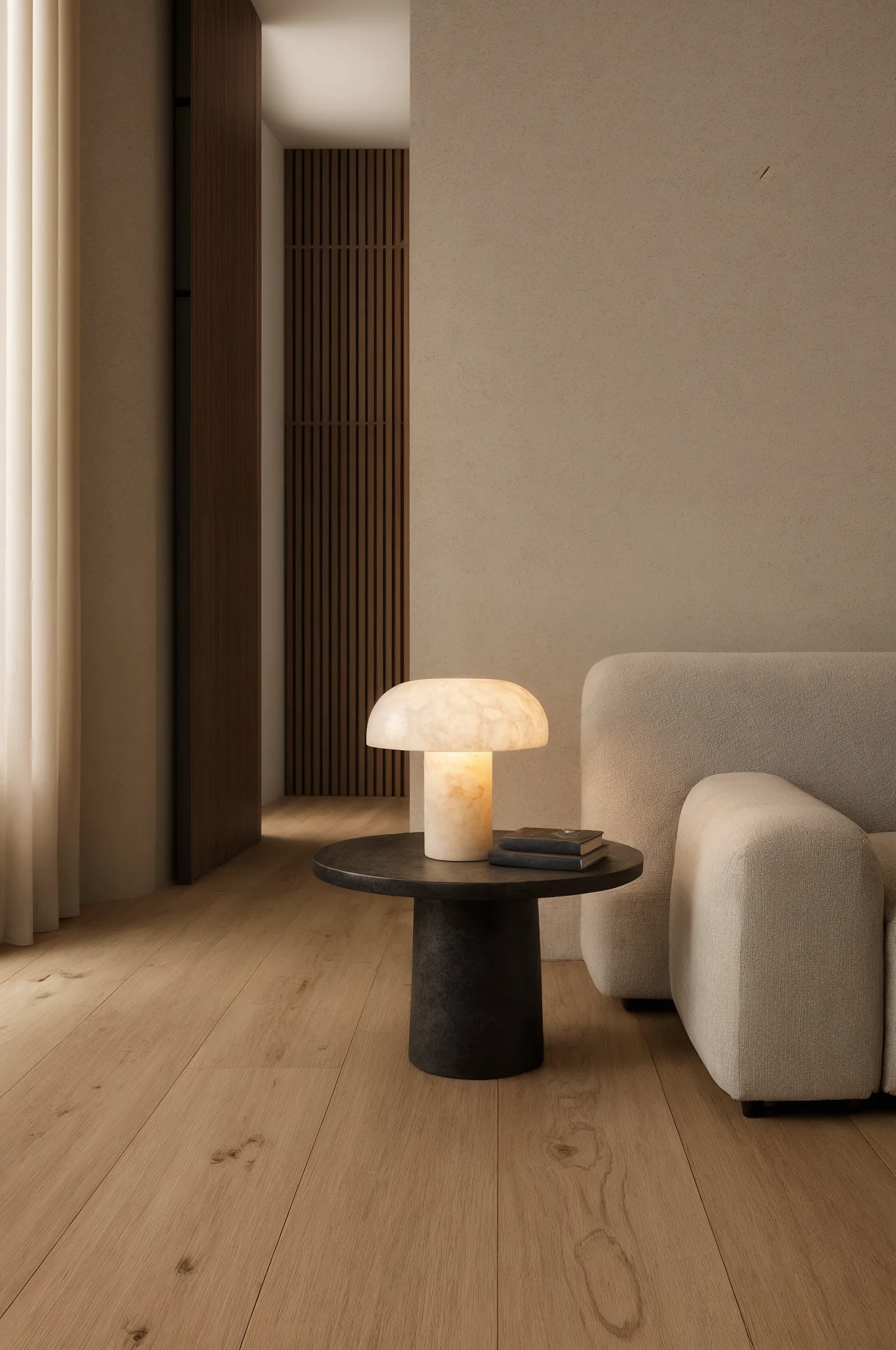 - Alabaster – półprzezroczysty i ciepły, rozprasza światło w sposób miękki: wprowadza atmosferę spokoju i kontemplacji. Jego struktura, widoczna dopiero po podświetleniu, staje się wizualnym komentarzem do idei światła, wpisanego w kamień. To materiał, który otwiera przestrzeń na subtelne doświadczenie światła: nie gwałtownego, lecz kontemplacyjnego.