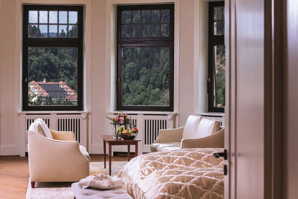 Dziewięć apartamentów na górnym poziomie i pierwszej kondygnacji Gut Berneck charakteryzuje się przestronnym, otwartym wystrojem. Położona na wzniesieniu nieruchomość zapewnia rozległy widok na miasto Schramberg i otaczający je Schwarzwald, a także na dziewięciopiętrowy budynek tarasowy (zbudowany w latach 1916-18) fabryki zegarów Junghans. Dwa zegary wiszą obok siebie w każdym pokoju jako hołd. Niektóre z mebli pierwotnie zdobiły słynny hotel Savoy (Baur en Ville) w Zurychu i dodatkowo podkreślają połączenie historycznego uroku i poczucia luksusu.