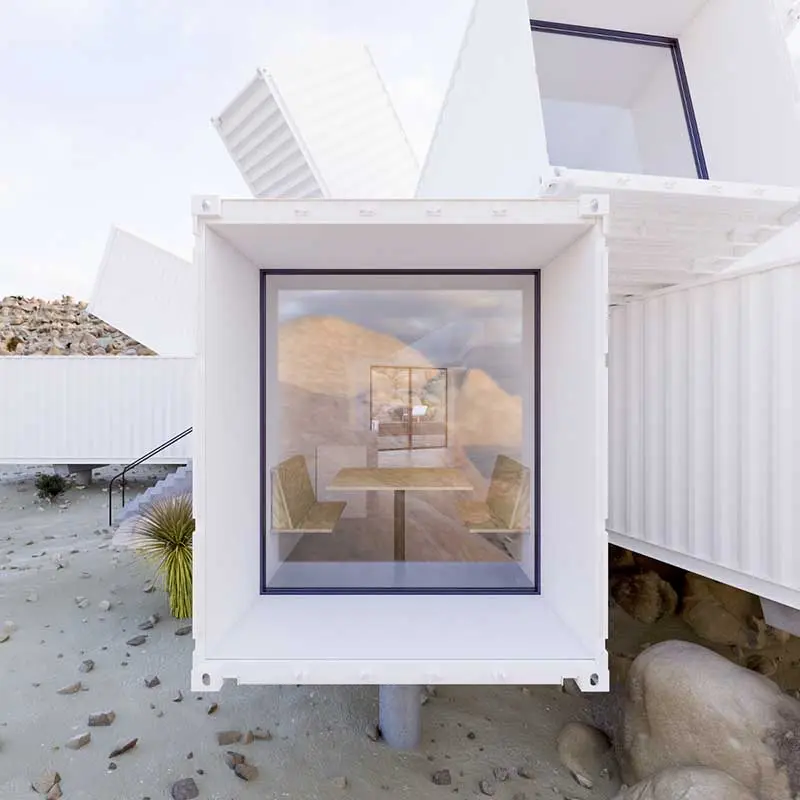 Osada Joshua Tree, zaledwie trzy godziny podróży od Los Angeles – to właśnie tam, w otoczeniu rezerwatu dzikiej przyrody, znajduje się 36-hektarowa posiadłość producenta filmowego. W ubiegłym roku zaprosił on tam swoich przyjaciół. Podczas pobytu pośród skał i pustynnych pejzaży jeden z nich rzucił luźno: „Wiecie, co by tu dobrze wyglądało?”. I pokazał fotografie z nigdy niewybudowanym biurem, projektem stworzonym kilka lat temu. Przy okazji następnej wizyty w Londynie producent poprosił o spotkanie z architektem Jamesem Whitakerem.