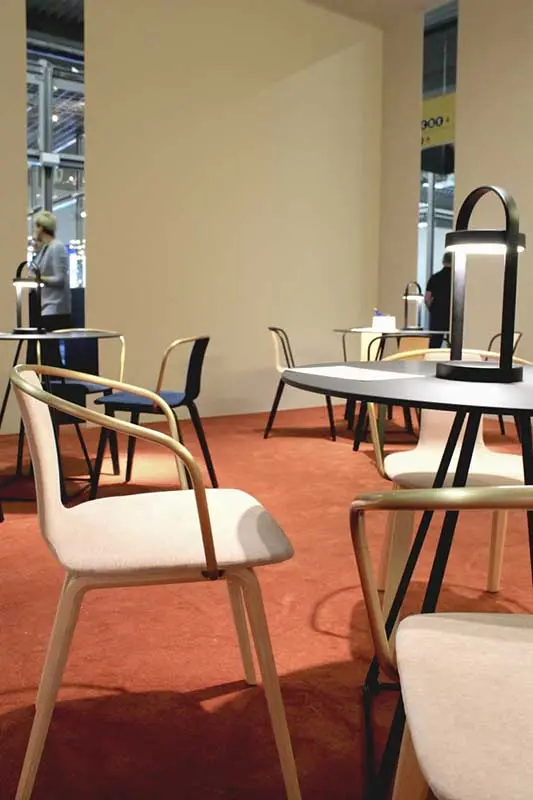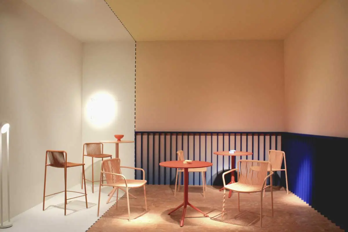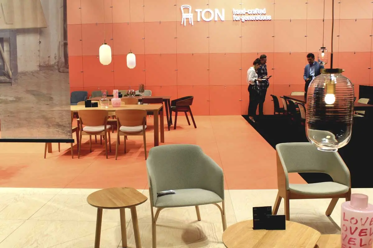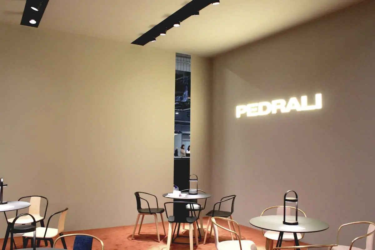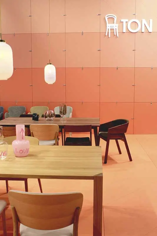 Kolejną silną tendencją barwną było połączenie rozbielonych pasteli z nasyconym kolorem, np. ceglanym odcieniem pomarańczowego. Bardzo interesujące, pod względem aranżacji i doboru barw było stanowisko marki Pedrali. Inspirację stanowiła historia włoskiej architektury i znamienne dla niej materiały: marmur, terakota i lastryko.