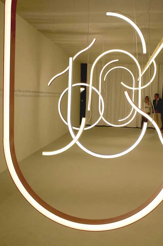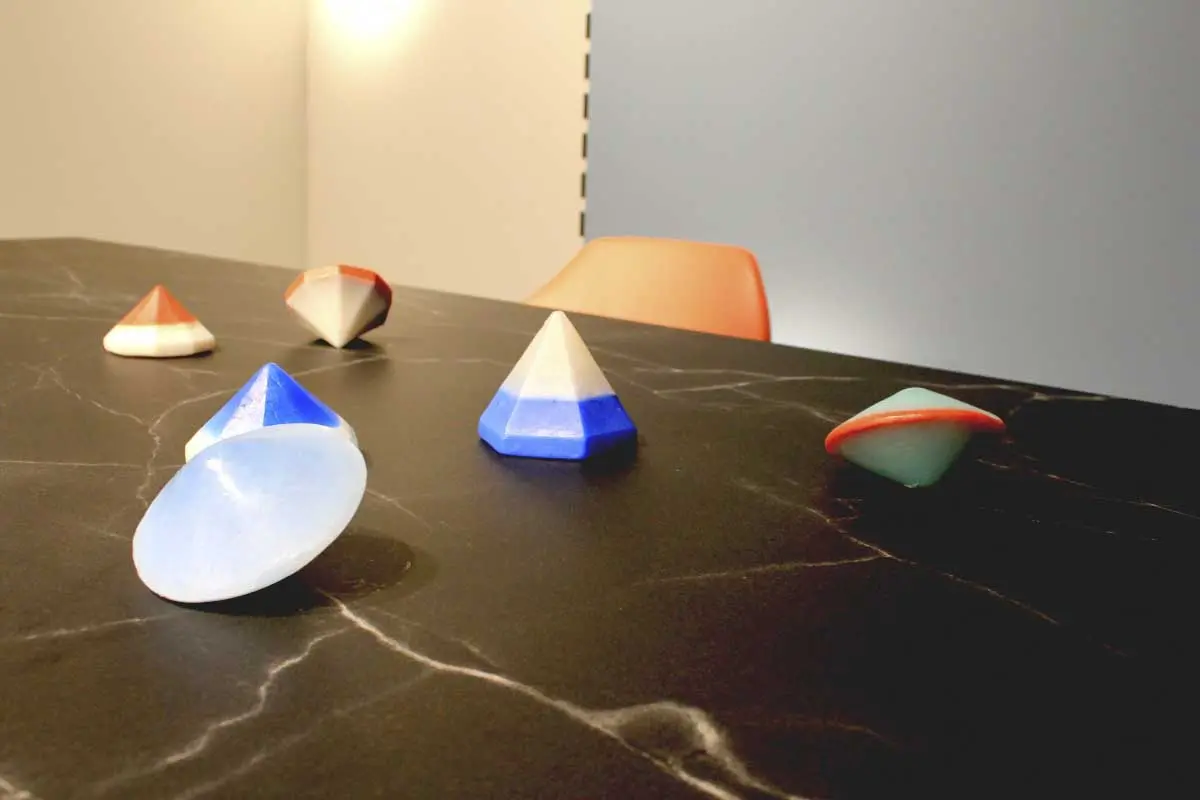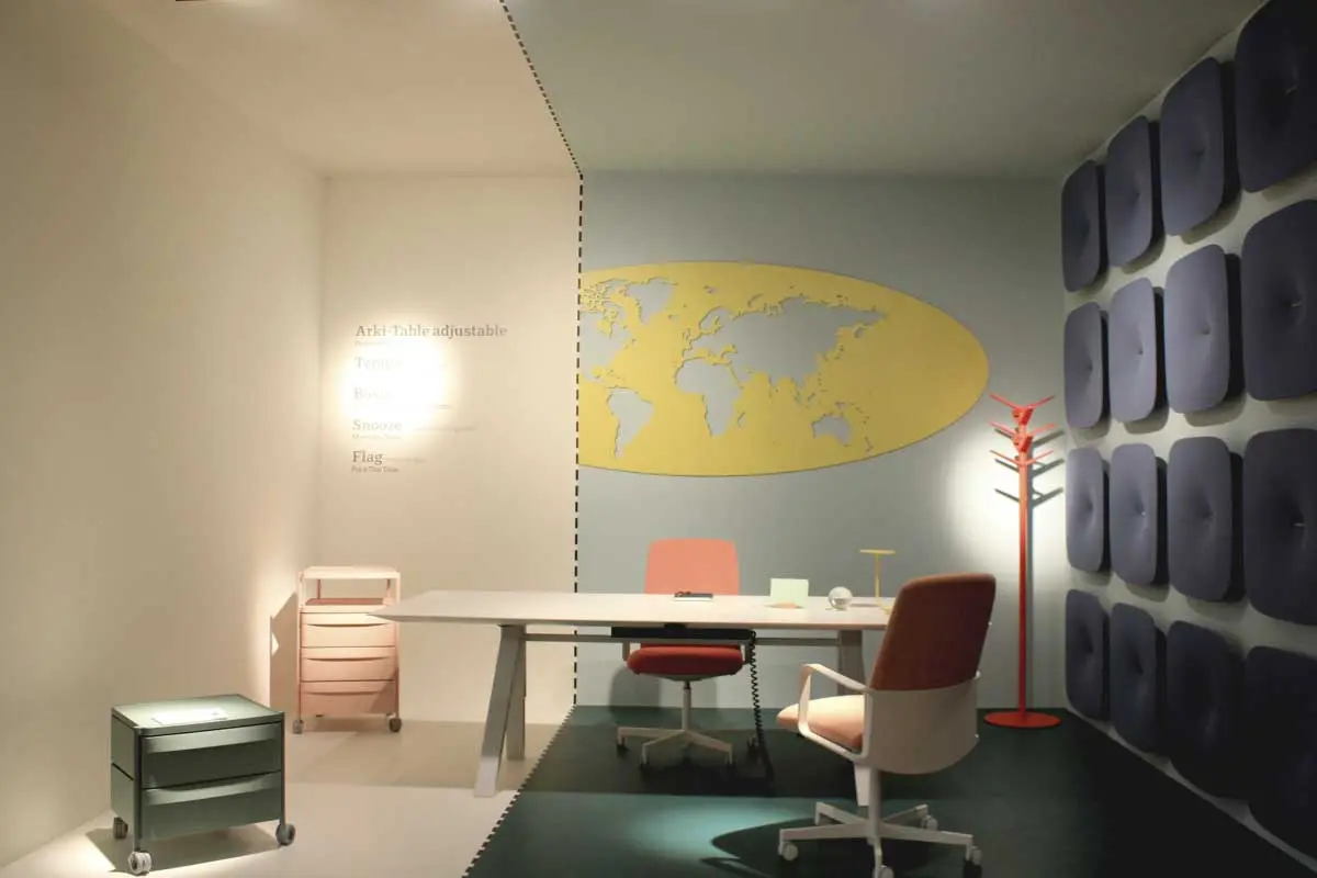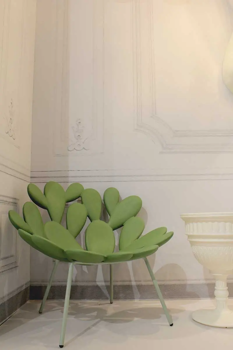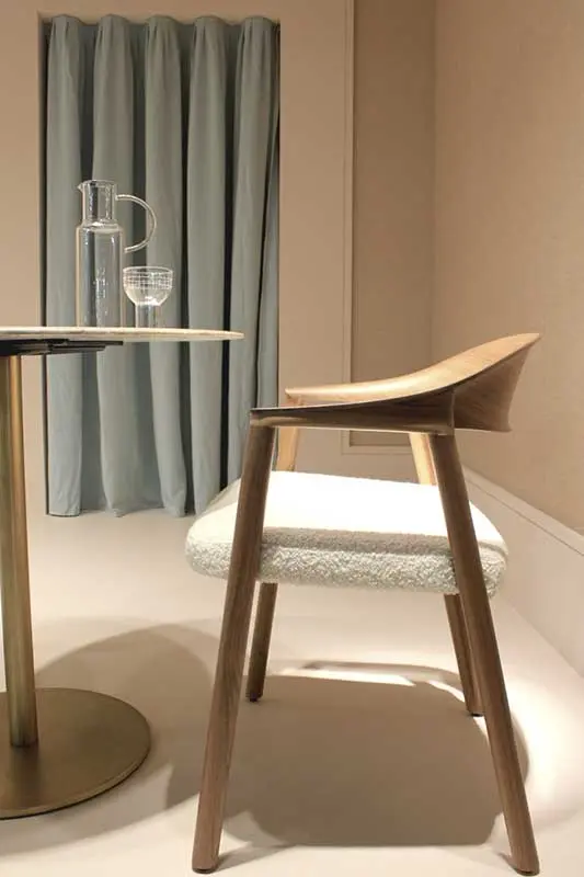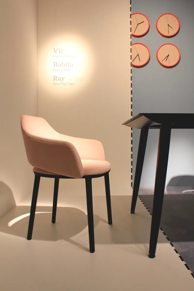 Kolejną silną tendencją barwną było połączenie rozbielonych pasteli z nasyconym kolorem, np. ceglanym odcieniem pomarańczowego. Bardzo interesujące, pod względem aranżacji i doboru barw było stanowisko marki Pedrali. Inspirację stanowiła historia włoskiej architektury i znamienne dla niej materiały: marmur, terakota i lastryko.
