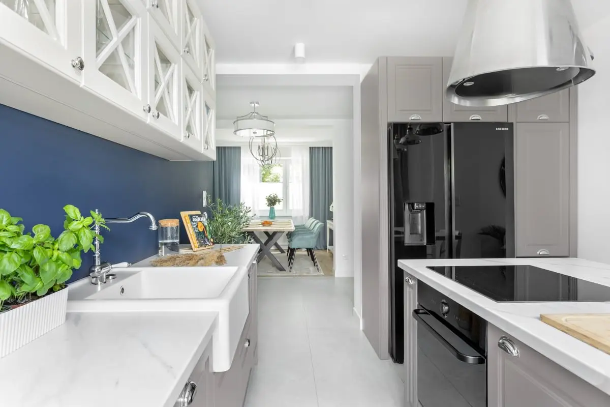 Kuchnia jest duża i przestronna. Wyspa będąca jej sercem umożliwia wspólne rodzinne gotowanie. Jest styl wyznaczają klasyczne meble w szaro – popielatym kolorze, wykończone eleganckimi frezami i srebrnymi uchwytami. Ich elegancki wygląd podkreślają białe witrynki powieszone na jednej ze ścian. Nieco angielską nutę przywołuje zlew ceramiczny dopełniony baterią w stylu retro. Granatowa ściana nad blatem łączy wizualnie wnętrze z całym projektem.