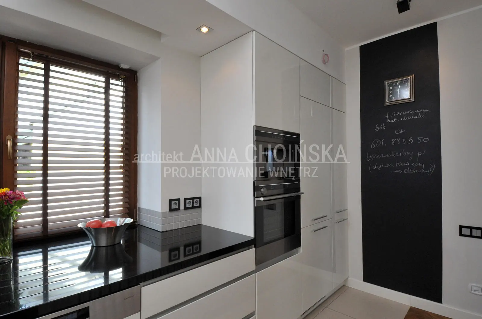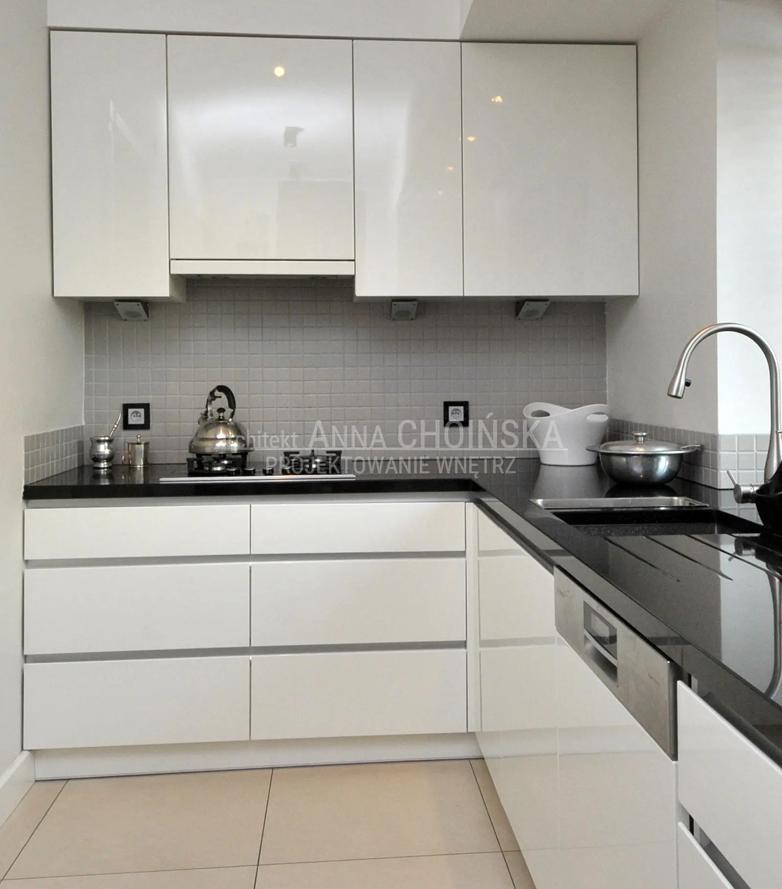 Kuchnia utrzymana w klasycznej kolorystyce bieli, szarości i czerni. Lekkie, błyszczące białe meble z czarnym blatem nadają niezwykłej elegancji. Także postawienie na szafki do sufitu to znakomity wybór, który się sprawdza prawie w każdej kuchni.