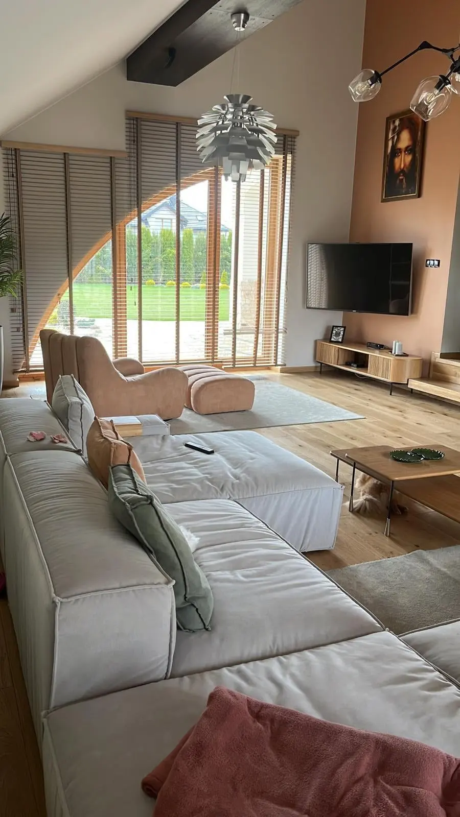 Salon po zmianach zyskał nowy styl i funkcjonalność. Architekta postawiła na ocieplenie przestrzeni i wybrała naturalną kolorystykę. Ściana, która imitowała kamień została pomalowana na oliwkowy kolor, a przy niej staną komfortowy, modułowy narożnik UMO od nobonobo. Pod łukowym oknem z drewnianymi żaluzjami znalazł swoje miejsce dość fikuśny, ale bardzo wygodny fotel Wadi. Dywany w jednolitym kolorze wydzielają czytelnie strefy w dziennej strefie domu.