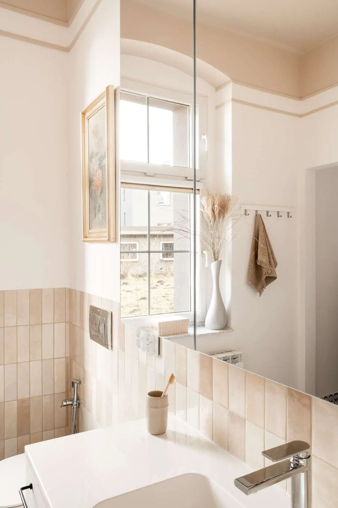 W głównej łazience, do której wejście jest z salonu, sufit został pomalowany na kolor beżowy. W pomieszczeniu znajduję się wanna, wc z bidettą oraz duża umywalka z szafką z lustrem. Wzorzyste płytki podłogowe ciekawie komponują się z niejednorodnymi płytkami w kształcie cegiełki. Z łazienki można przejść do pralni.