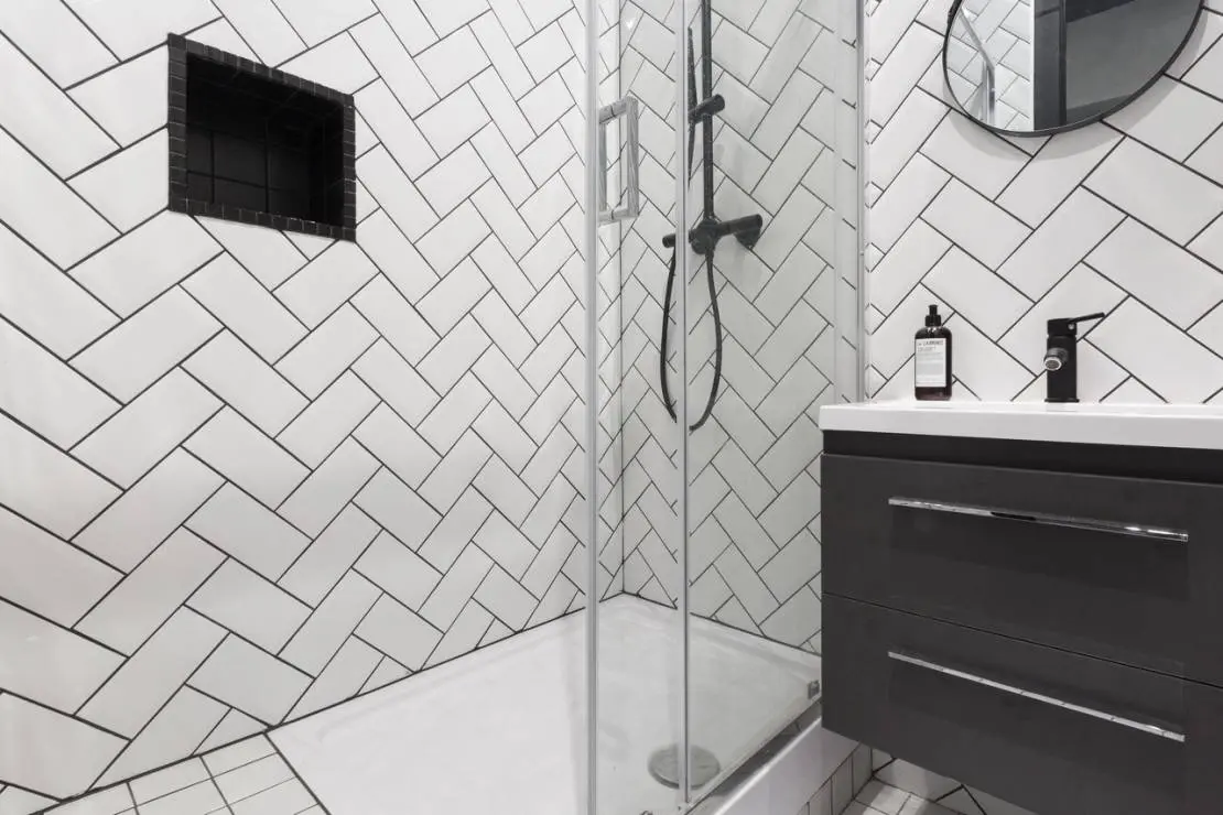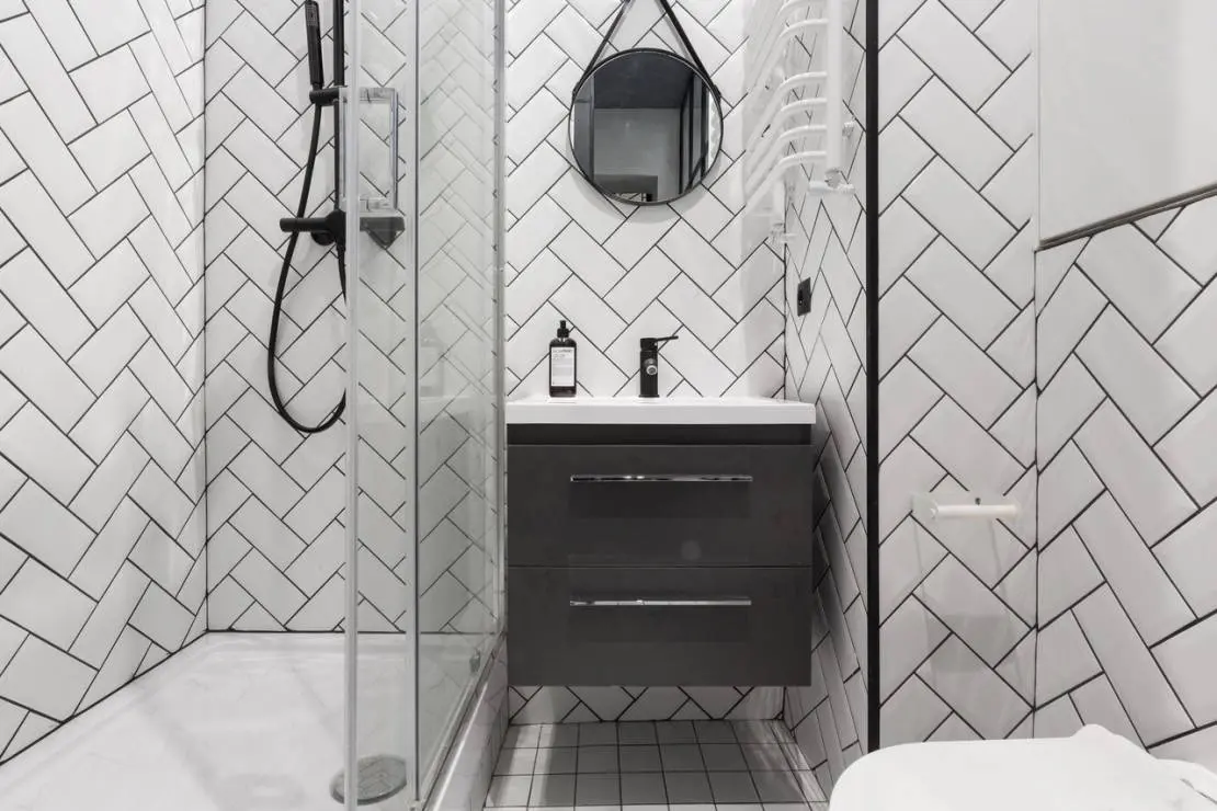 Na niewielkiej powierzchni w łazience udało się uzyskać ciekawy aranżacyjny efekt. Płytki białe ułożone we wzór chevron podkreślają indywidualny charakter wnętrza. Całość dopełnia stylowy prysznic w czarnym kolorze. Wybór kolorów black and white jest ponadczasowy i zawsze będzie wyglądał dobrze.