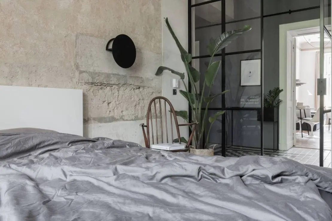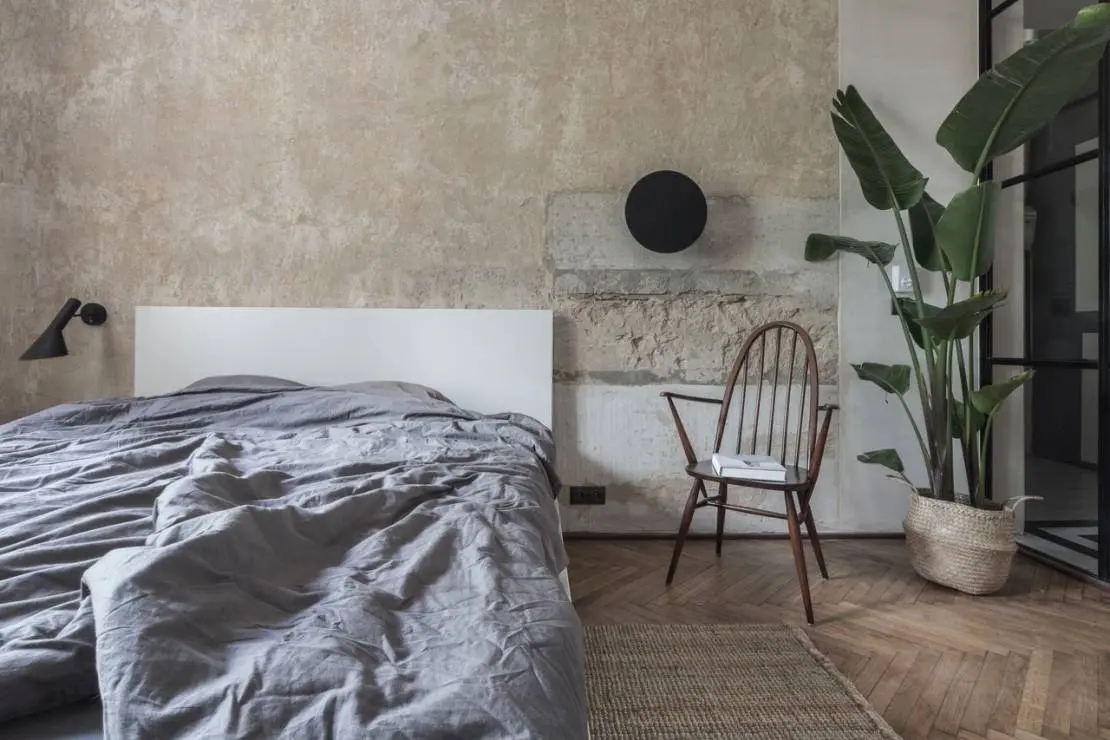 Surowa ściana w sypialni dodatkowo podkreślona lnianą pościelą i zasłonami w szarościach.