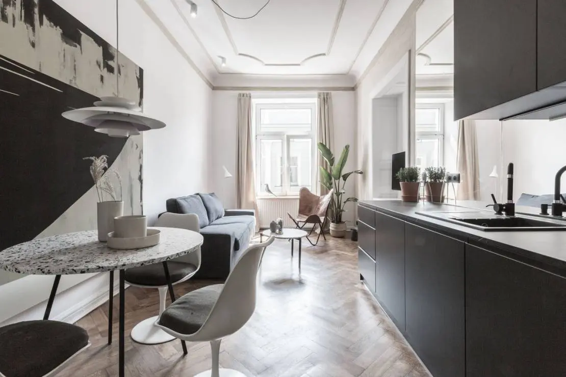 Dzięki tym zabiegom, mimo niewygodnego układu, udało się uzyskać funkcjonalne wnętrze. Metamorfoza mieszkania 45m2 przeznaczonego na wynajem też może wyglądać znakomicie, a oto dowód, który zachwyca już od wejścia. Mieszkanie jest urządzone minimalistyczne, a znajduje się vis-à-vis Muzeum Sztuki w kamienicy.