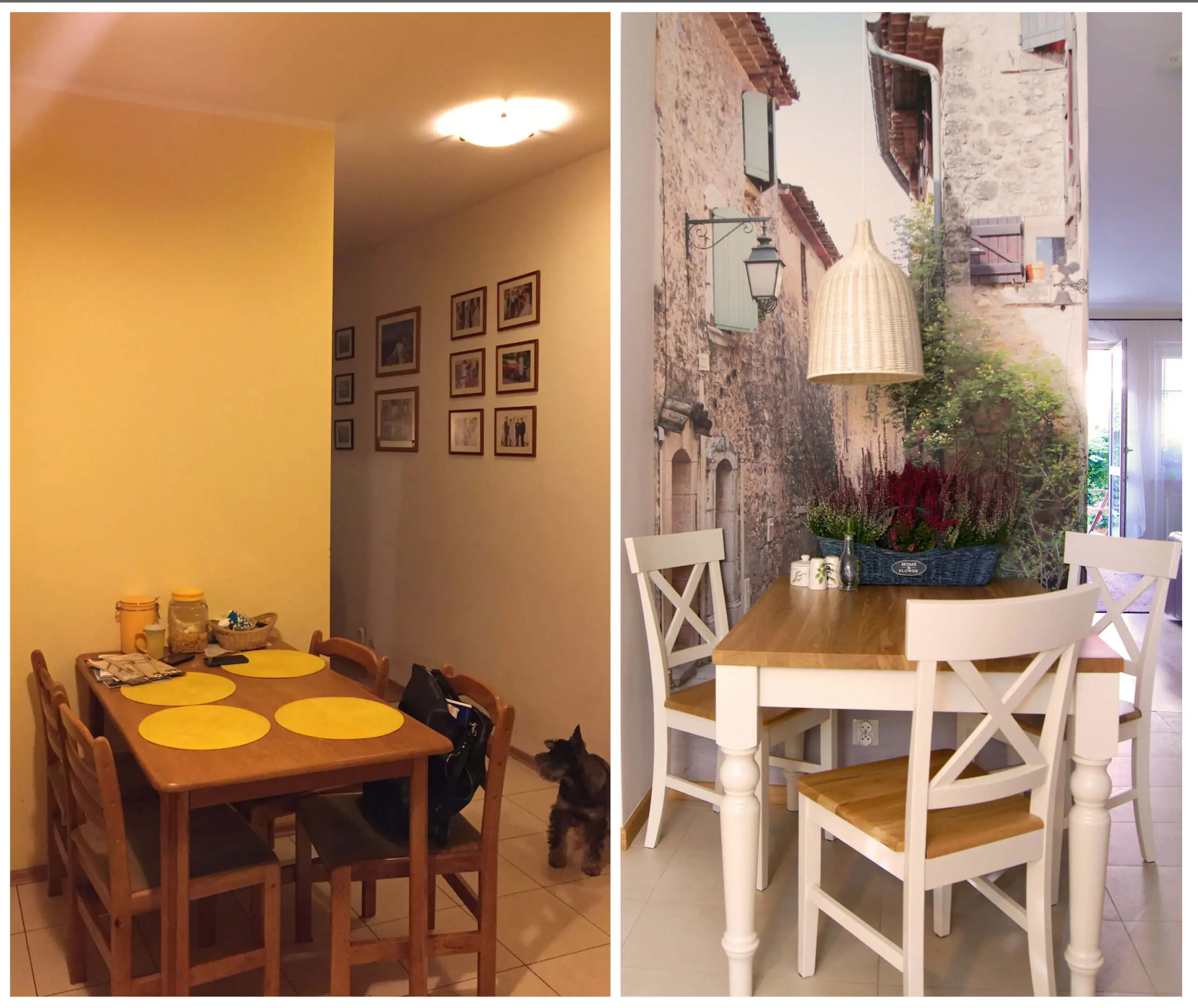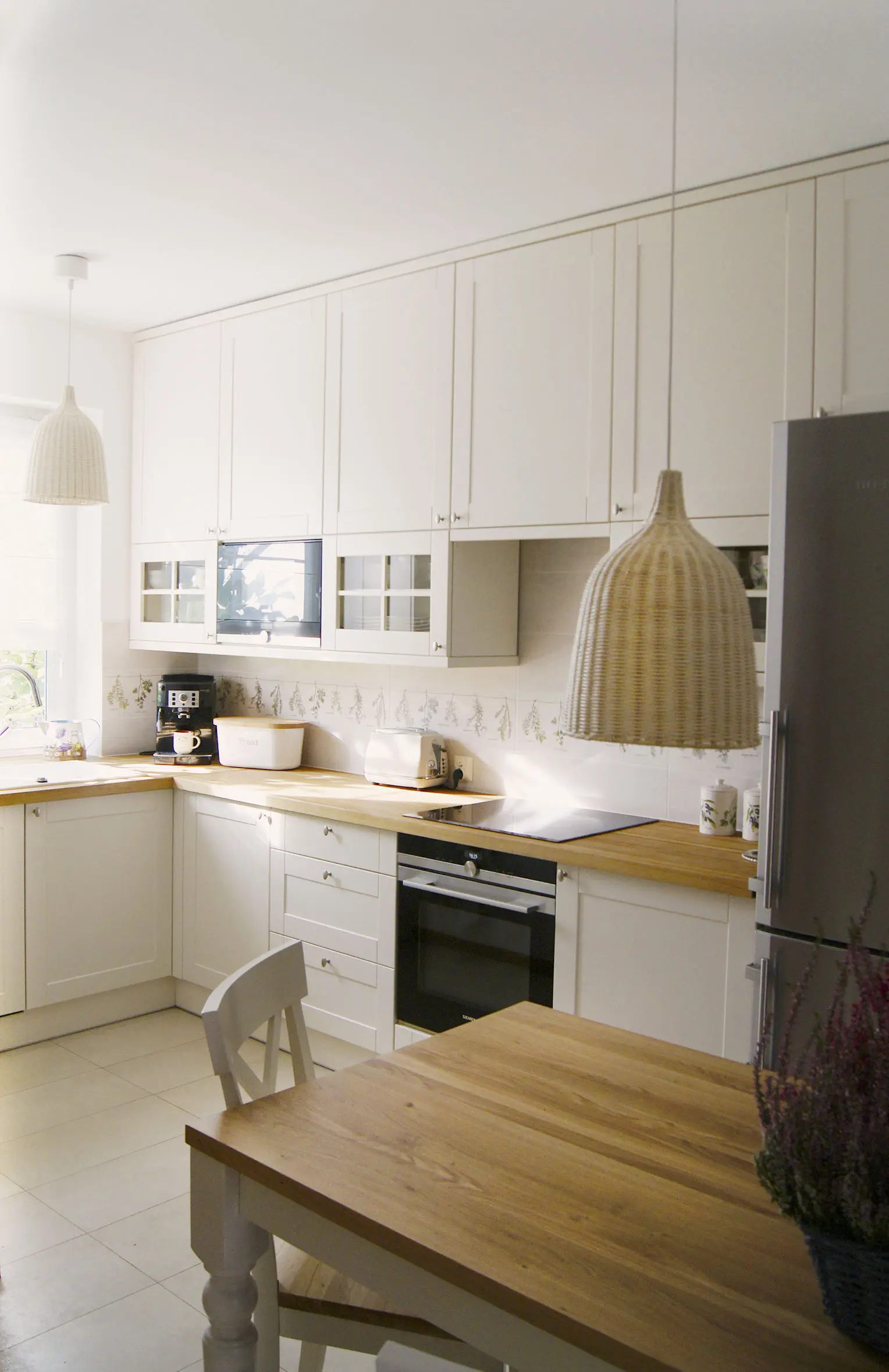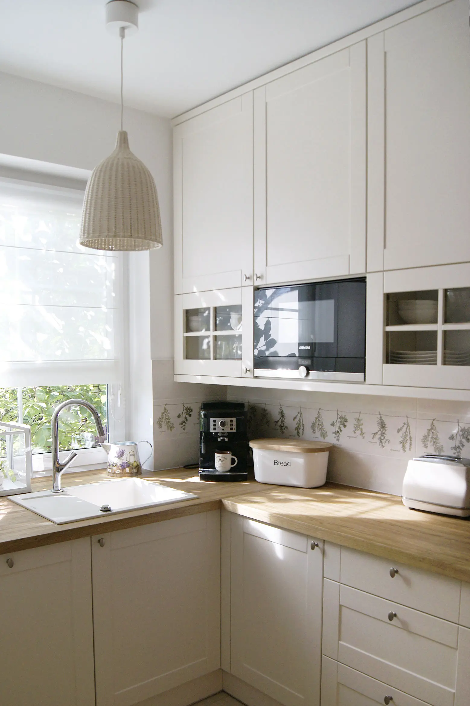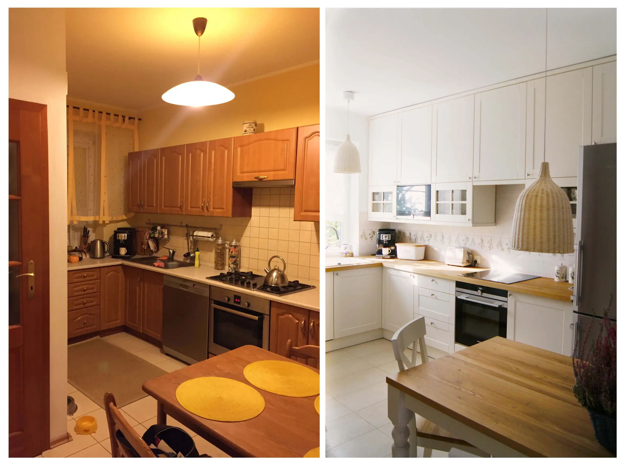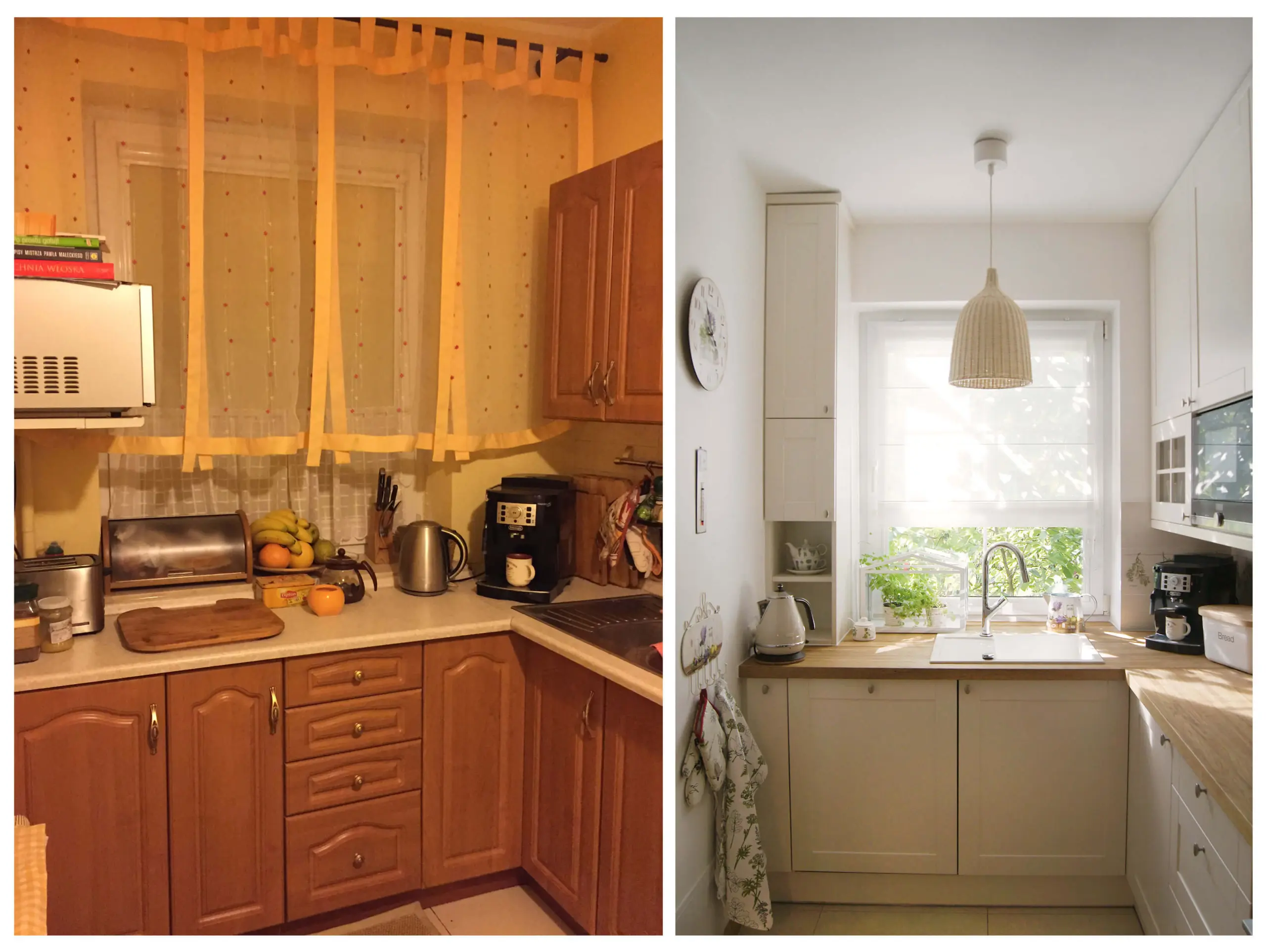 Zobaczcie metamorfozę kuchni w niewielkim mieszkaniu na warszawskim Bemowie. Mało atrakcyjna, ciemna zabudowa kuchenna zyskała zupełnie nowy charakter. Jasne szafki okazały się strzałem w dziesiątkę! Pomieszczenie optycznie zyskało na przestronności. Wnętrze jest jasne i świeże, a dzięki rustykalnym elementom i fototapecie zyskało również na przytulności.