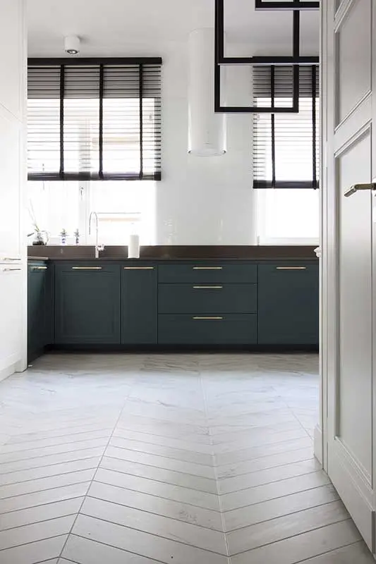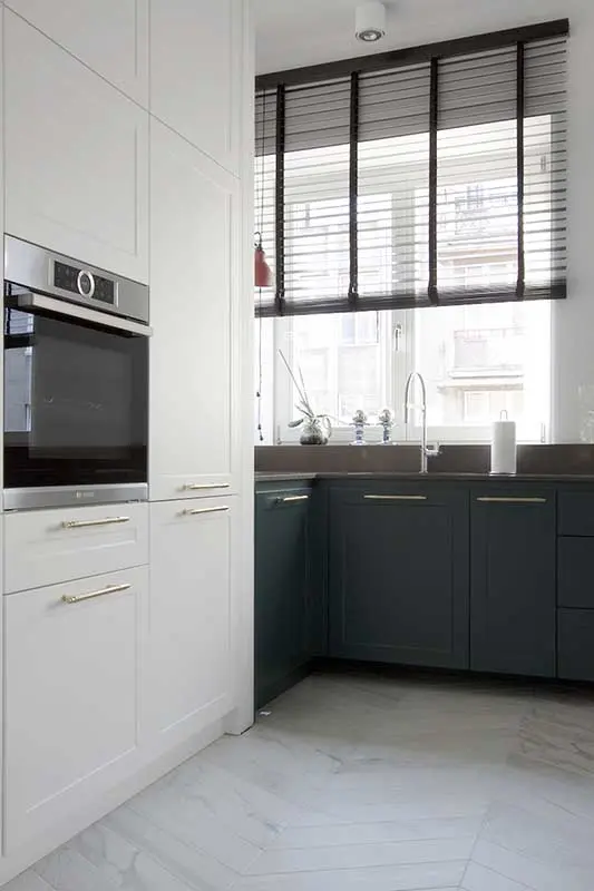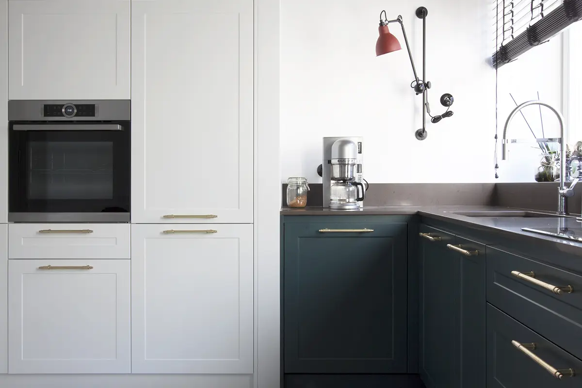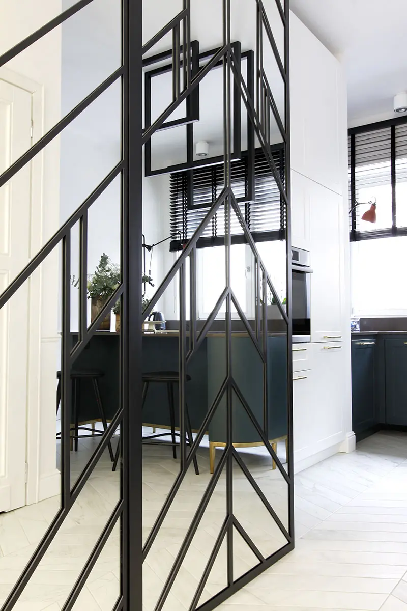 Korytarz prowadzi do serca każdego mieszkania czyli kuchni. Zaprojektowane do niej meble, wykonano w dwóch kontrastujących kolorach. Jasna, wysoka zabudowa konkuruje o uwagę z zabudową niską w intensywnym, butelkowozielonym kolorze. Granitowe blaty oraz wykonane na zamówienie mosiężne okucia wieńczą dzieło, dodając całości elegancji. Funkcjonalność kuchni dodatkowo zwiększono przez umieszczenie w jej centrum wyspy, której zaokrąglona bryła i fazowane fronty, nawiązują do epoki modernizmu. Lustrzana ścianka z dekoracyjnymi listwami, inspirowana jest motywami zdobniczymi, wykorzystywanymi przez Art déco.