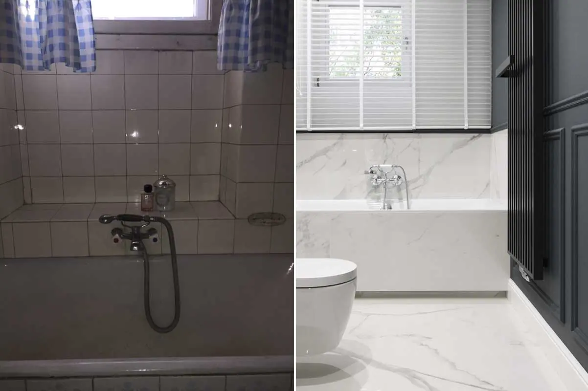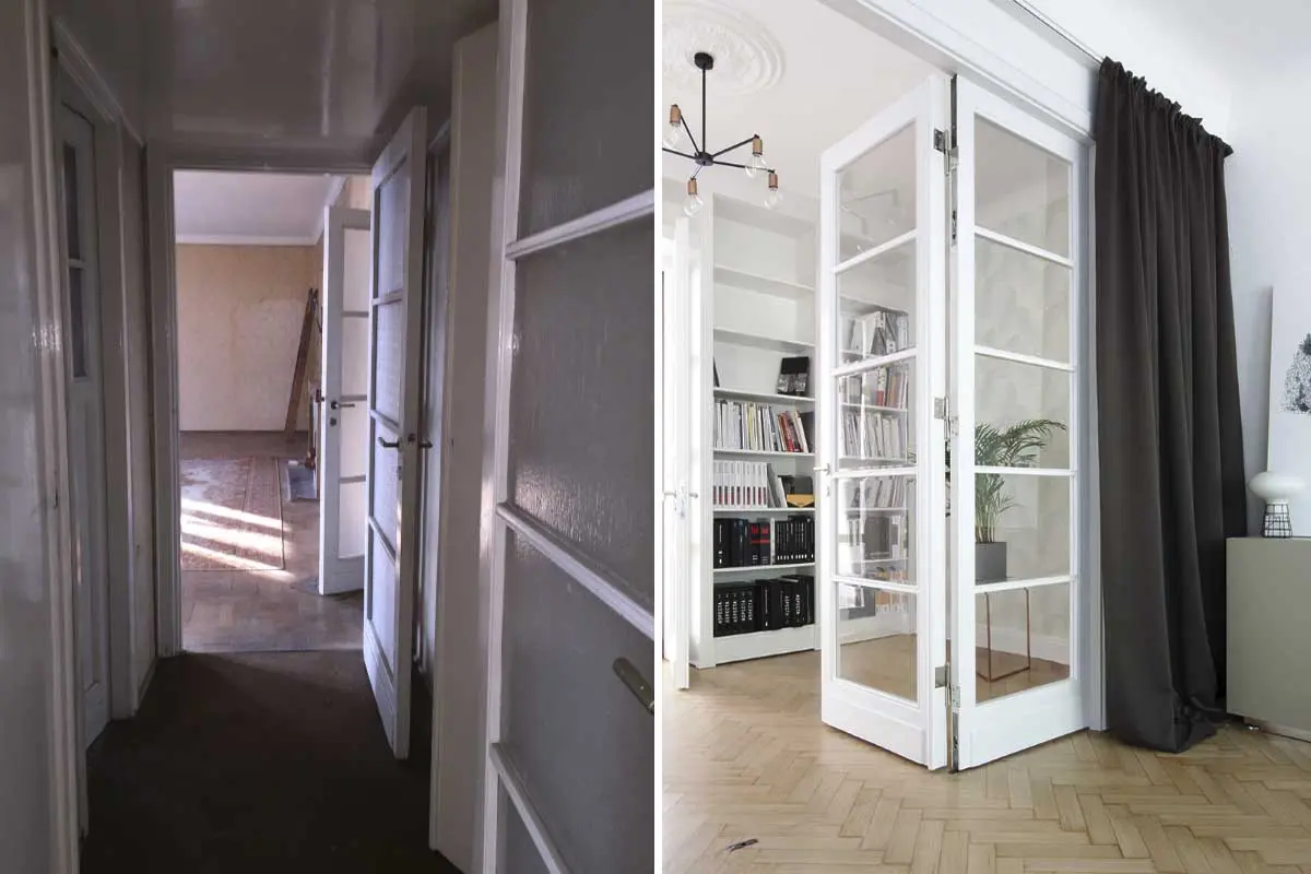 Mieszkanie sprzed metamorfozy to, jak podkreślają architektki, widok dla ludzi o mocnych nerwach. Oglądając zdjęcia zastanego lokalu jeszcze bardziej docenia się ogrom pracy i kreatywności, jakie zostały włożone w jego urządzenie. Przestrzeń holu pokrywa elegancka, jasna posadzka z terakoty, ułożona w chevron. Ściany ozdobione lamperiami z sztukateryjnych paneli, przywodzą na myśl okres świetności łódzkiej architektury. Na tym tle postanowiono wyróżnić stylizowany grzejnik w głębokim, grafitowo-zielonym kolorze. Natomiast na końcu korytarza, za przeszklonymi drzwiami zaczyna się mały hol z odnowionym parkietem dębowym, regałem na książki i tapetą z motywem floralnym. W tej części zdecydowano się, także na sztukateryjną rozetę sufitową, będącą kolejnym nawiązaniem do historii miejsca. Została ona skontrastowana z nowoczesną wersją żyrandola. Portal z oszklonymi skrzydłami, nawiązuje do oryginalnej stolarki.
