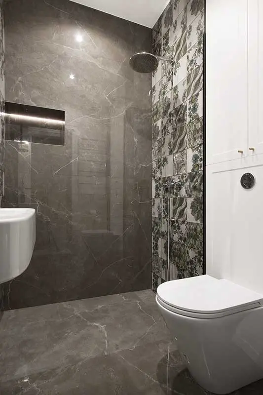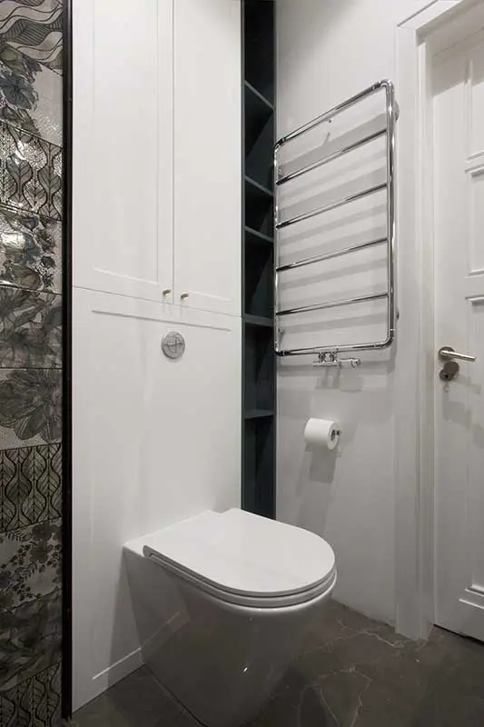 Przy kuchni znajduje się mała łazienka dla gości. Stworzono tam przytulne i eleganckie wnętrze, stosując bardzo nietypowe, w tak małych pomieszczeniach, rozwiązania jak ciemne kolory czy wielkoformatowe płytki. Wisienką na torcie są wykonane na zamówienie lampy, stylizowane na Art déco, które wyznaczają granicę ciętego i fazowanego lustra.