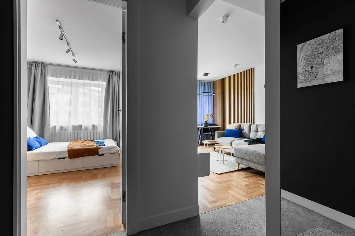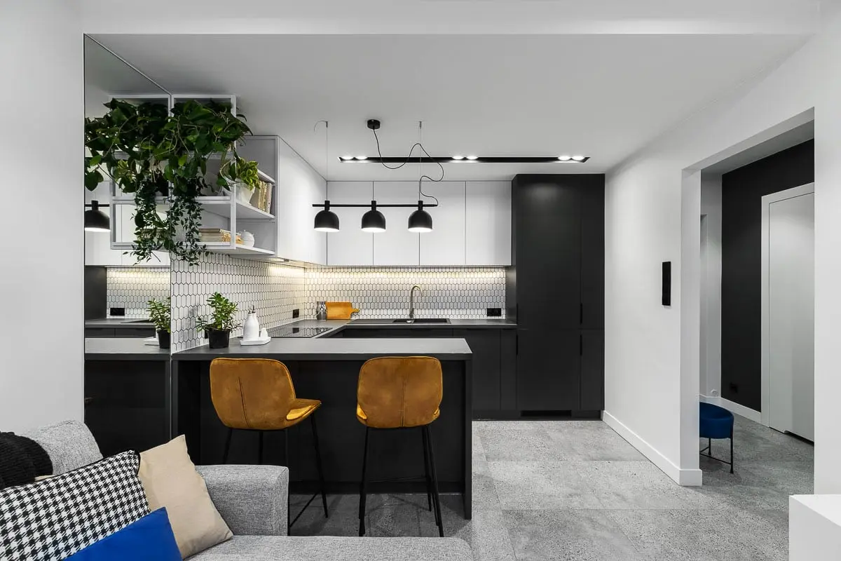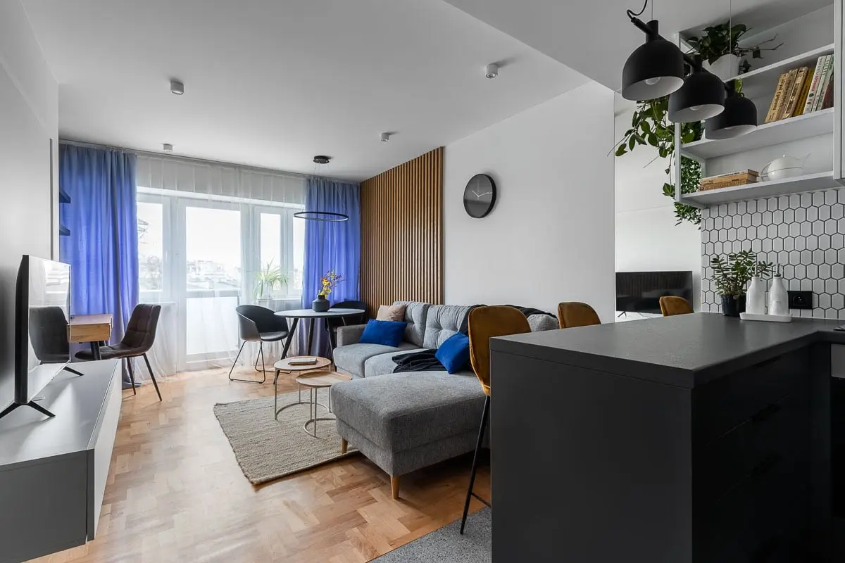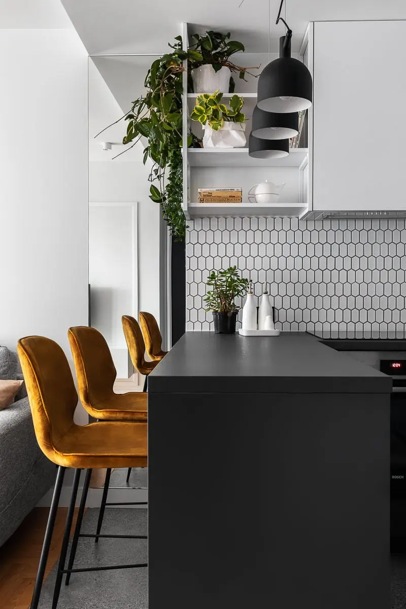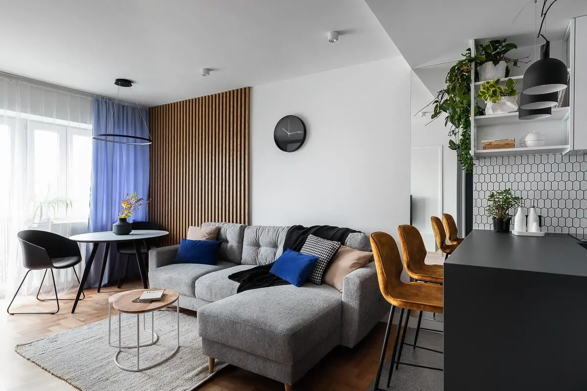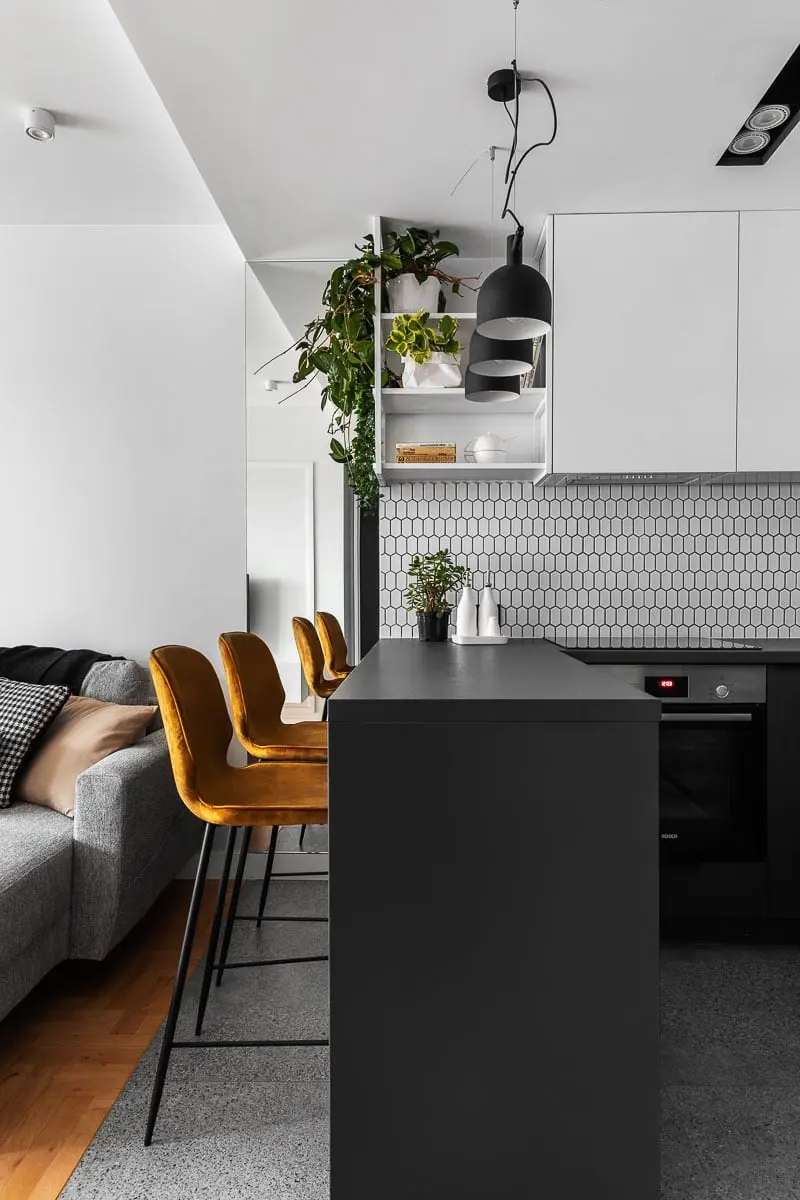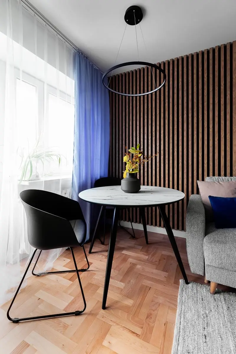 Aranżacja mieszkania nawiązują delikatnie do stylistyki PRL czyli czasu powstania osiedla dzięki modnym, dębowym lamelom w pokoju dziennym i sypialni. Całe wnętrze ma charakter prosty i nowoczesny, podkreślony antracytowymi akcentami na wybranych ścianach, meblach oraz zabudowie kuchni. Ozdobę zabudowy kuchennej stanowi ażurowa konstrukcja półek wiszących od strony salonu-wykorzystywana przez mieszkańców jako zielnik, miejsce na ekspozycję roślin. Ten ożywczy element realizacji wzmacnia odbicie w lustrze zamontowanym tuż przy półwyspie.