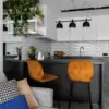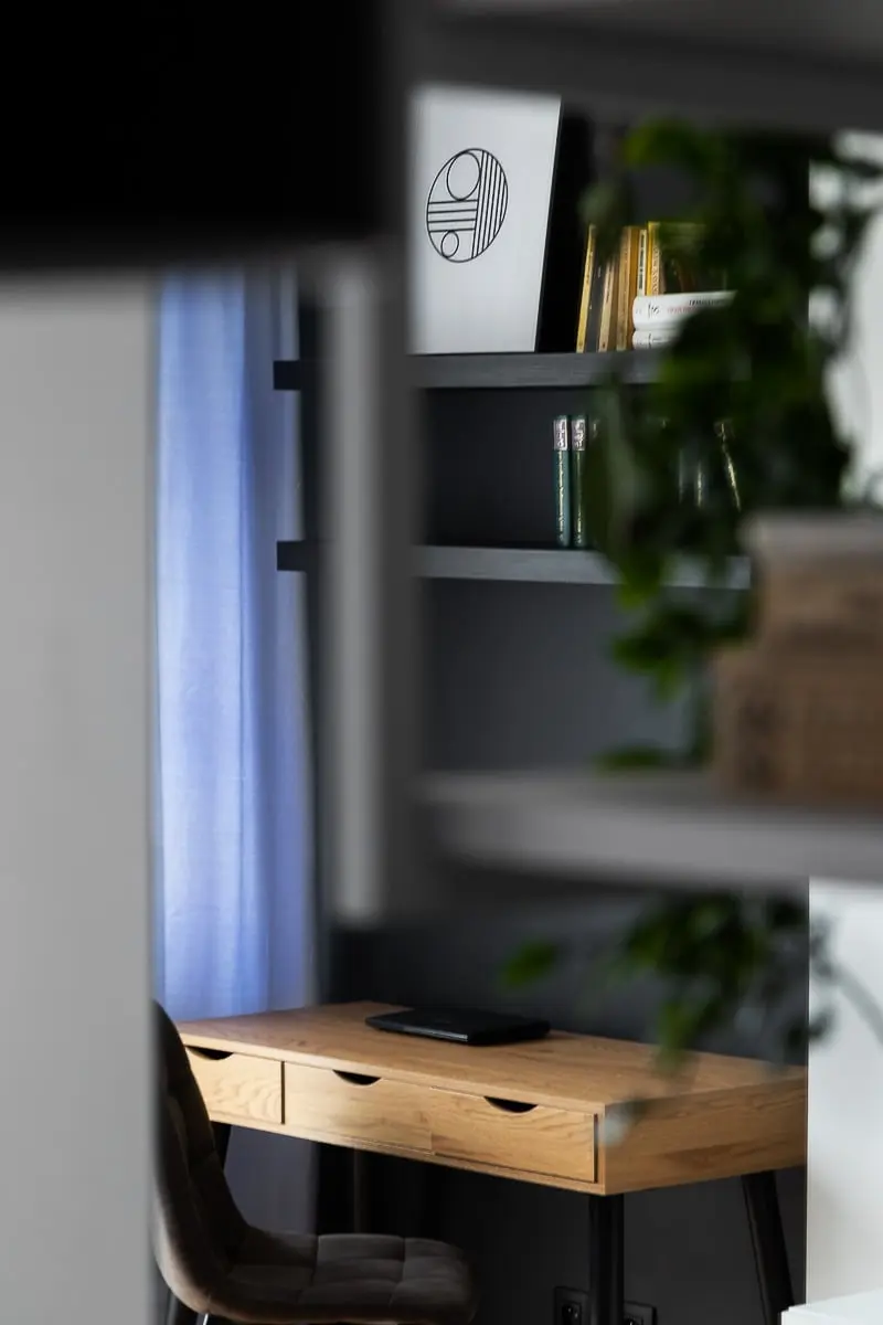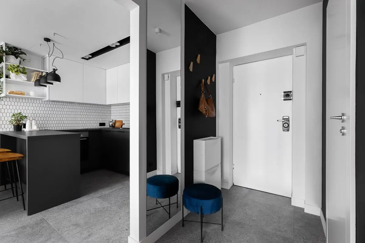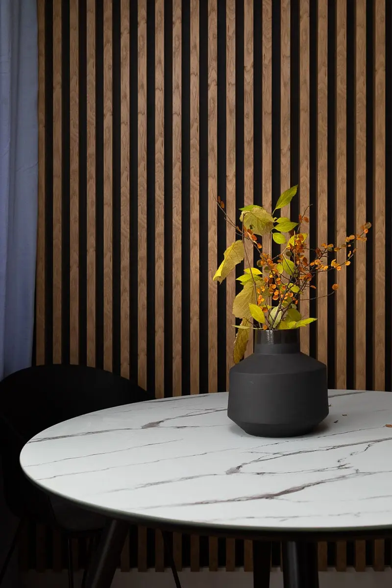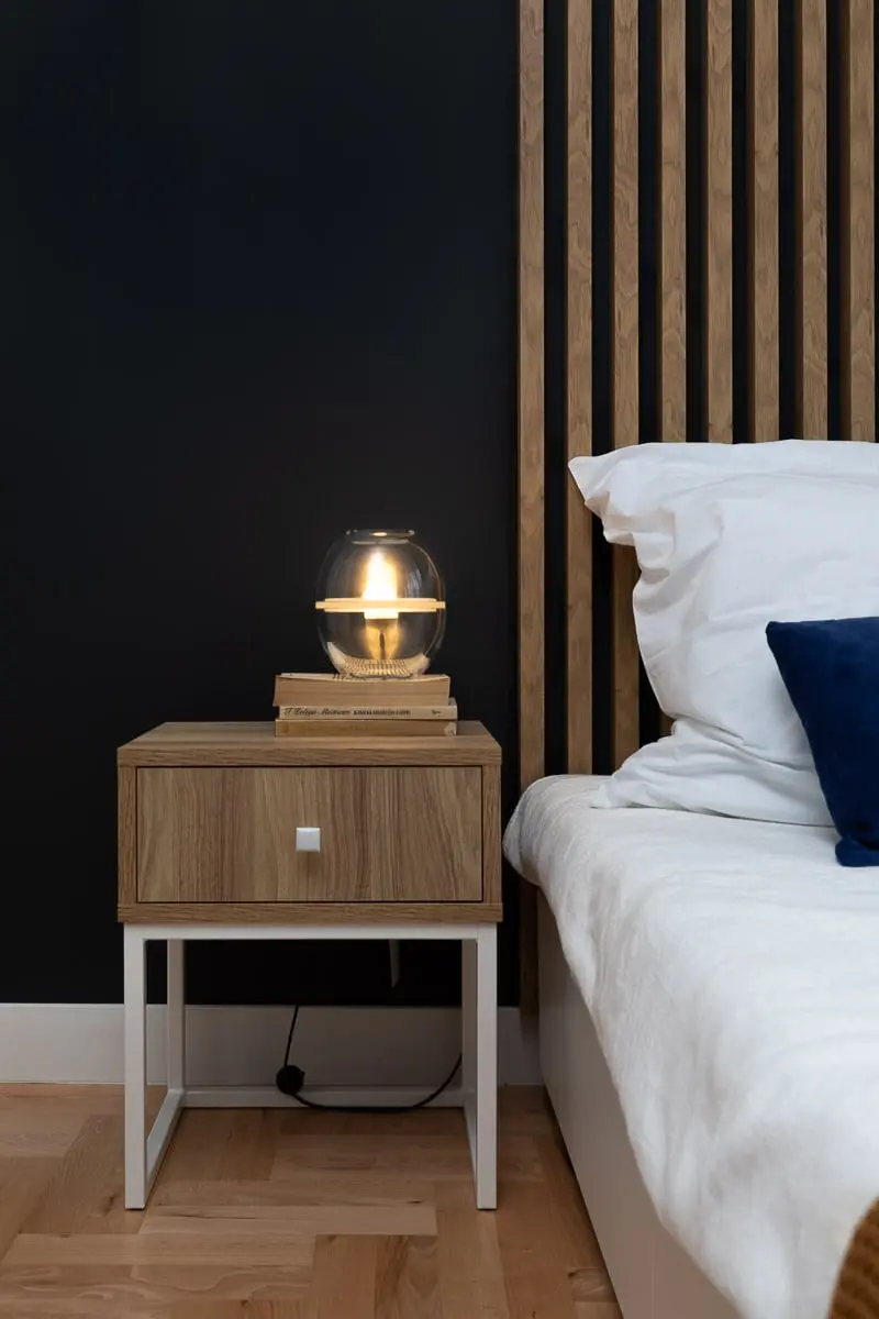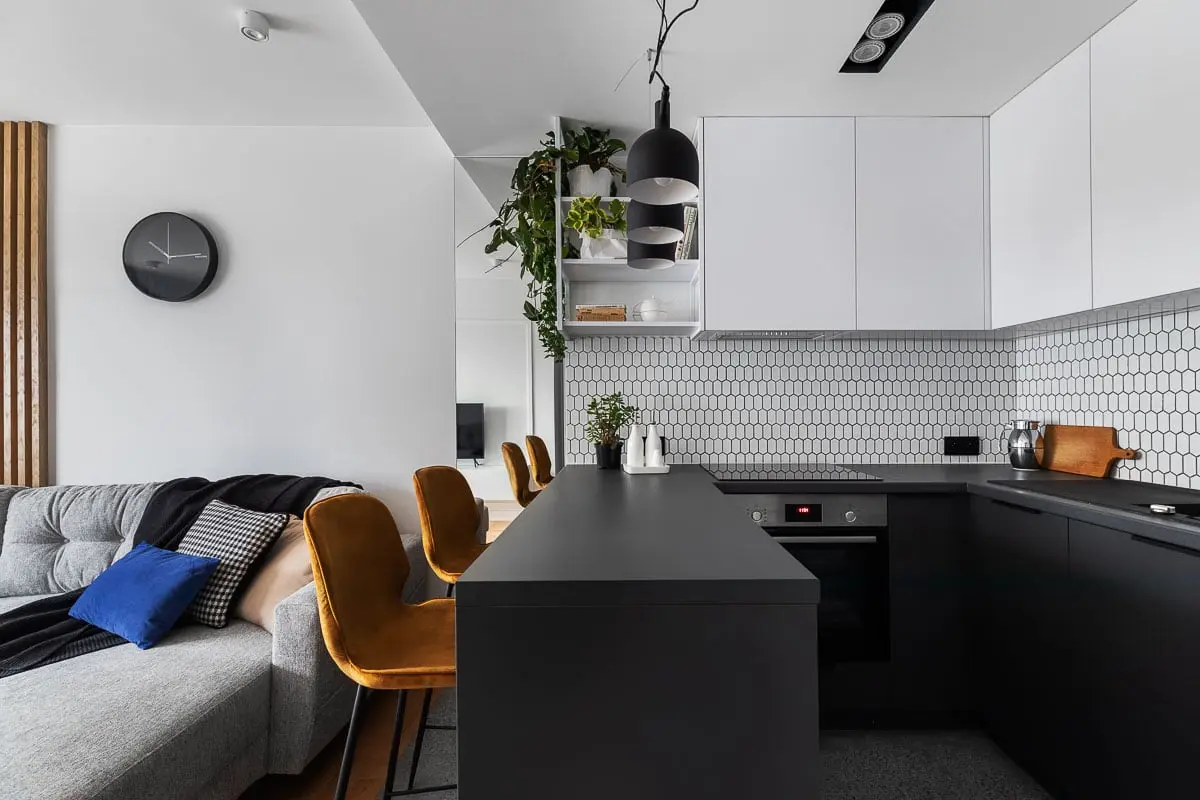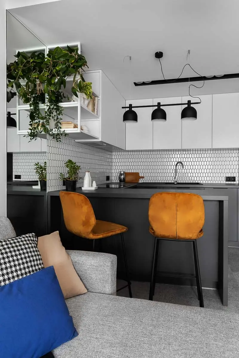 Aranżacja mieszkania nawiązują delikatnie do stylistyki PRL czyli czasu powstania osiedla dzięki modnym, dębowym lamelom w pokoju dziennym i sypialni. Całe wnętrze ma charakter prosty i nowoczesny, podkreślony antracytowymi akcentami na wybranych ścianach, meblach oraz zabudowie kuchni. Ozdobę zabudowy kuchennej stanowi ażurowa konstrukcja półek wiszących od strony salonu-wykorzystywana przez mieszkańców jako zielnik, miejsce na ekspozycję roślin. Ten ożywczy element realizacji wzmacnia odbicie w lustrze zamontowanym tuż przy półwyspie.