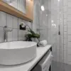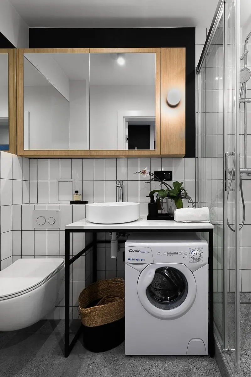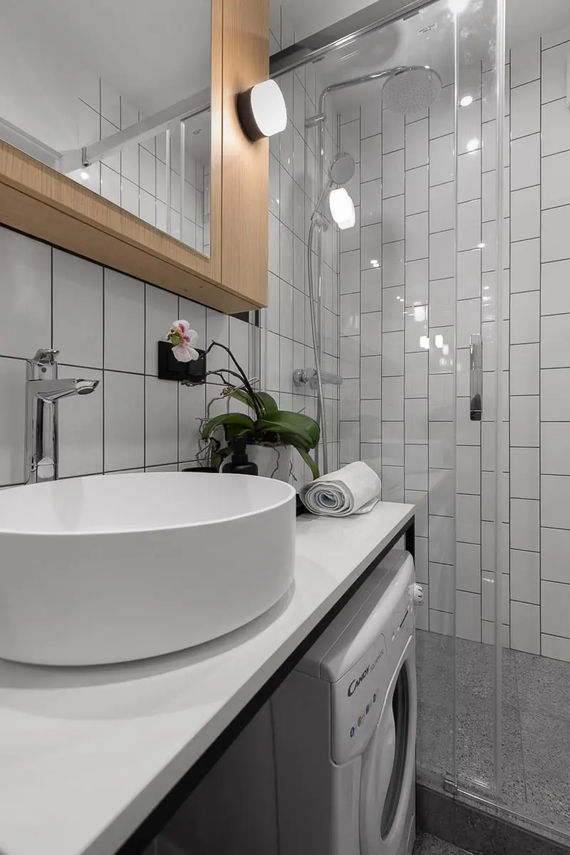 Dziś płytka pralka znalazła miejsce wraz z koszem na brudną odzież pod blatem umywalkowym. Powyżej umywalki nablatowej znajduje się szafka wisząca z lustrem i kinkietem mieszcząca kosmetyki i środki czystości. Po prawej stronie natomiast zlokalizowana jest komfortowa kabina prysznicowa. Podstawą aranżacji są białe płytki typu „metro” bez fazowań, w prostym pionowym układzie z przesunięciem na głównej ścianie wewnątrz kabiny.