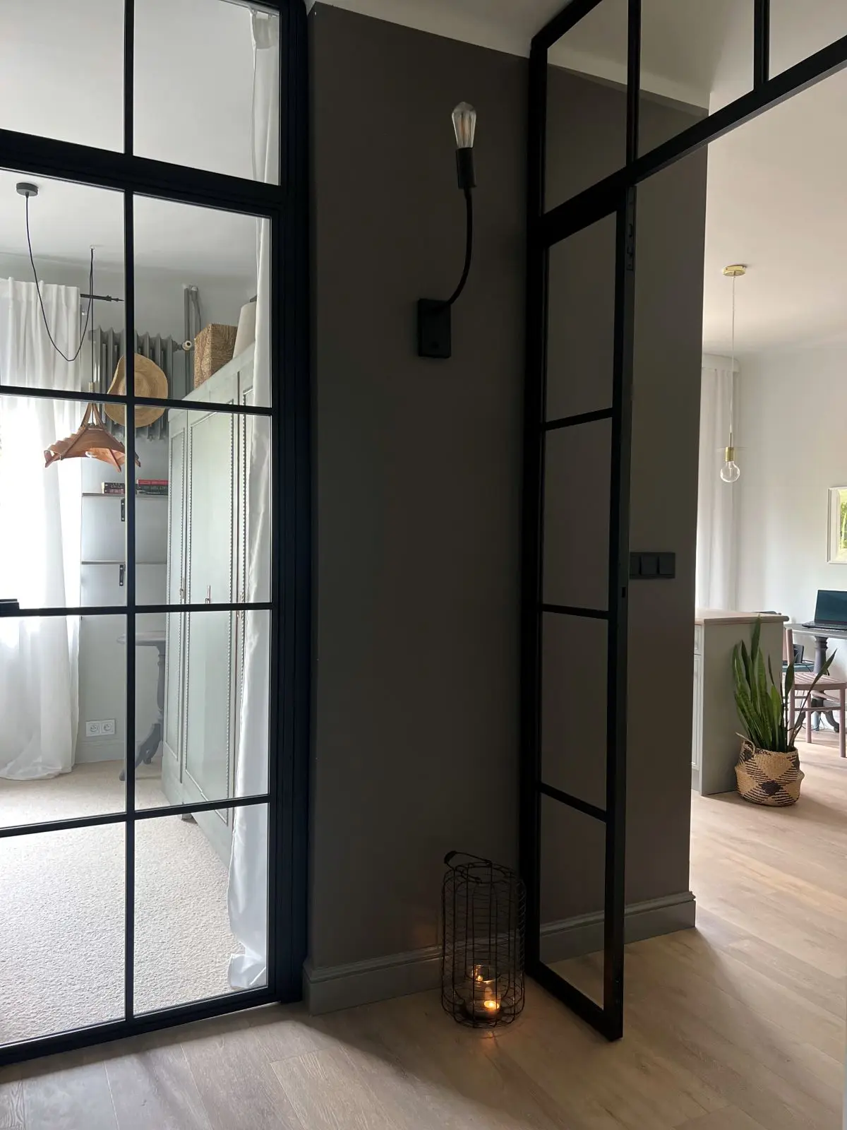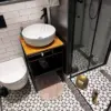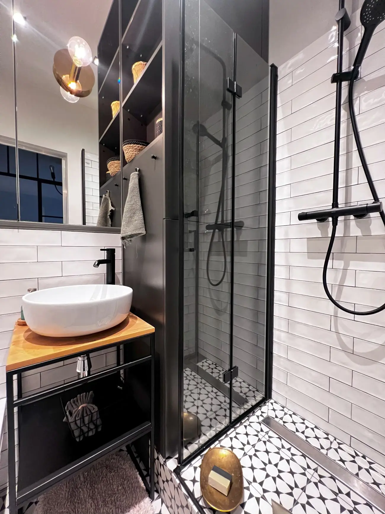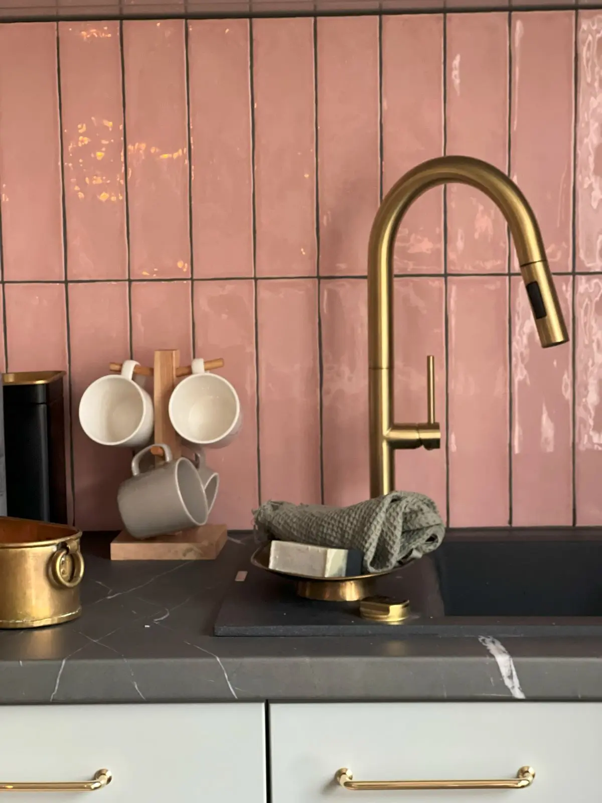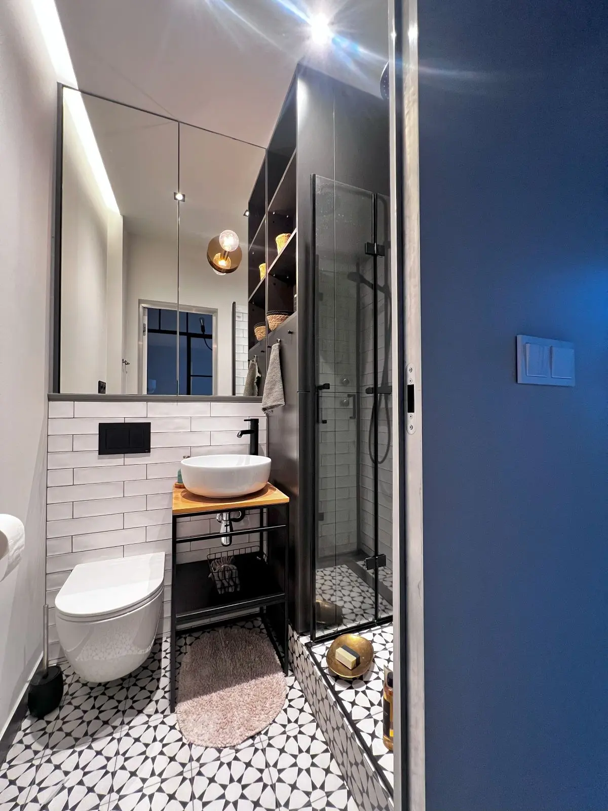 Kolor stał się kluczem do odmiany. Brudny róż, pudrowe płytki, loftowa czerń – każdy element składał się na harmonijną całość, oddającą ducha miejsca. Drzwi loftowe, wysokie i imponujące, dodały przestrzeni elegancji i charakteru, podczas gdy bateria w kolorze szczotkowanego złota stanowi subtelny akcent luksusu.