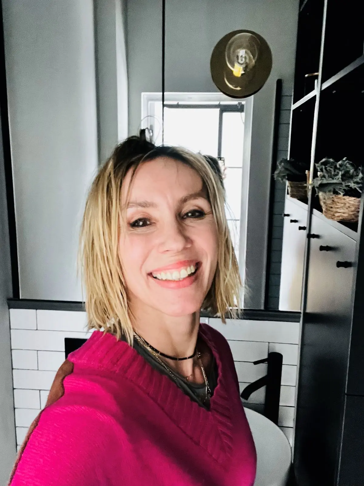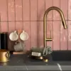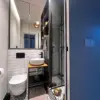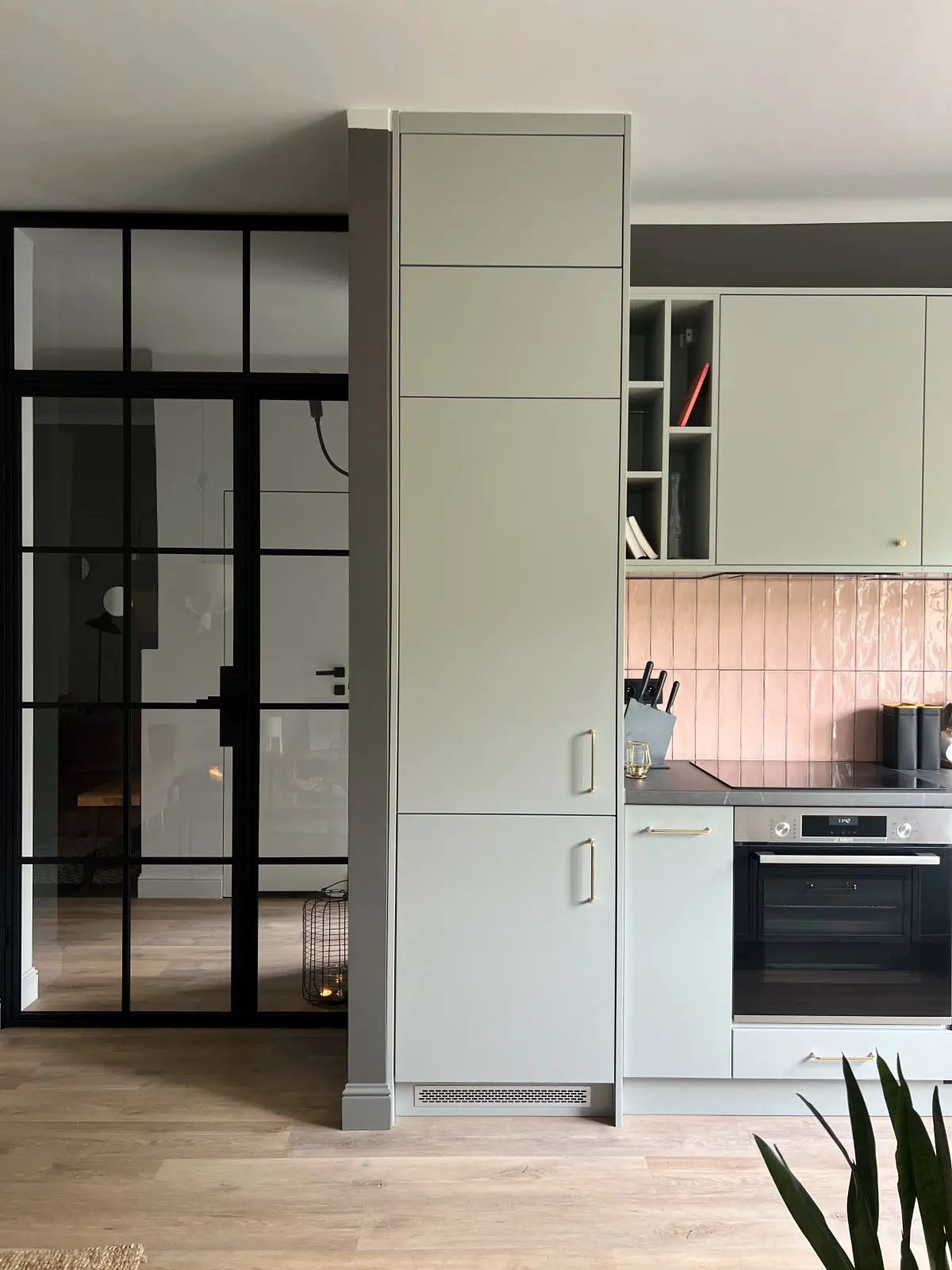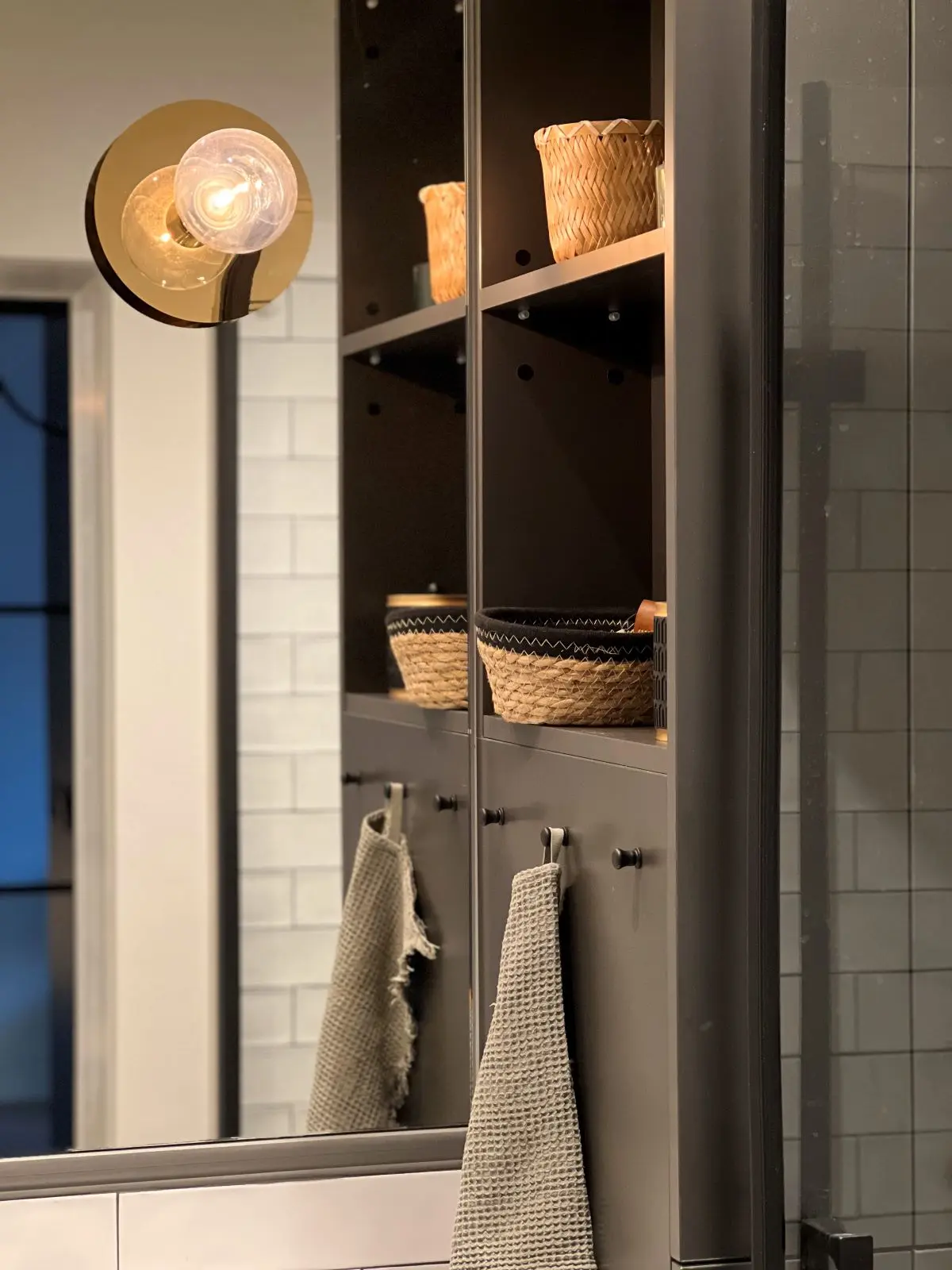 Kolor stał się kluczem do odmiany. Brudny róż, pudrowe płytki, loftowa czerń – każdy element składał się na harmonijną całość, oddającą ducha miejsca. Drzwi loftowe, wysokie i imponujące, dodały przestrzeni elegancji i charakteru, podczas gdy bateria w kolorze szczotkowanego złota stanowi subtelny akcent luksusu.