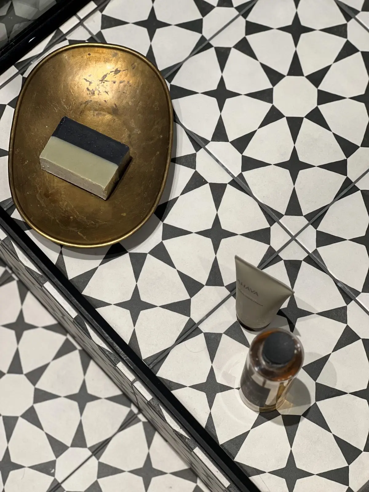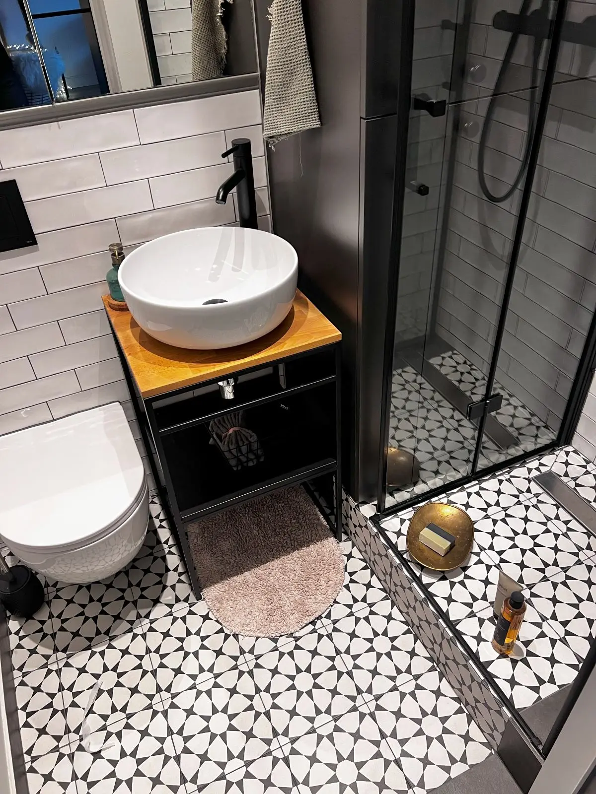 W łazience, czarno-białe płytki wzorzyste marki Cifre stworzyły eleganckie tło dla codziennych rytuałów, podkreślając unikalny charakter tego miejsca.