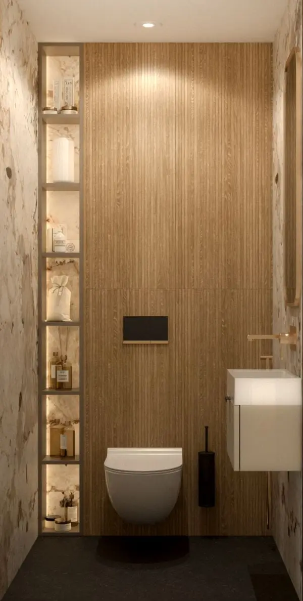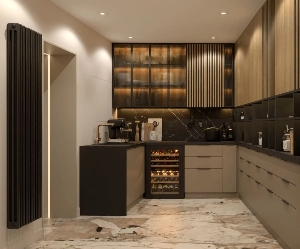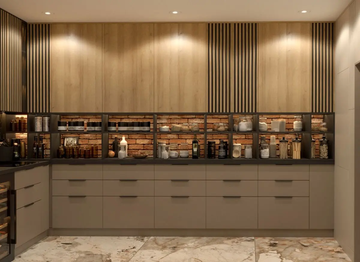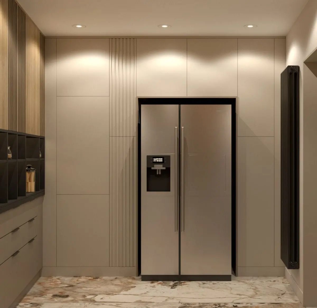 By zgodnie z rytuałem oddawać się przyjemności degustacji win, nie mogło tu zabraknąć również chłodziarki. Swoje miejsce odnalazła w nowocześnie urządzonej spiżarni. Elegancka zabudowa bardziej bowiem przypomina luksusową kuchnię, niż tradycyjne pomieszczenie do przechowywania żywności i wiktuałów. Wykonana z drewna, z modnym pionowym ryflowaniem, przeszklonymi frontami szafek wiszących oraz subtelnie ukrytą w zabudowie z beżowej, matowej płyty lodówką “side by side”, prezentuje się niezwykle szykownie. Kuchnia w pełni wykorzystuje dostępną przestrzeń, zapewniając nie tylko maksimum miejsca do przechowywania, ale też strefę roboczą ze zlewozmywakiem i płytą indukcyjną. Można tu magazynować składniki, jak i przygotowywać szybki obiad lub przyjęcie dla przyjaciół.